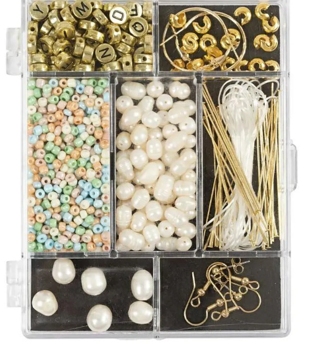 Et fint kit med mange forskellige slags perler, elastiksnor og tilbehør til smykkeproduktion af armbånd, halskæder og øreringe.