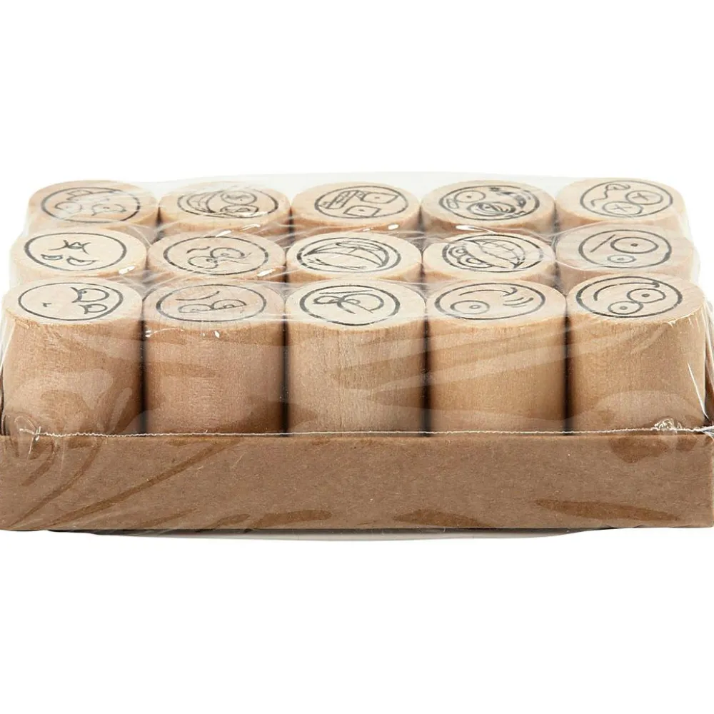 Pakken består af 15 stempler med træskafter og trykflader i gummi.