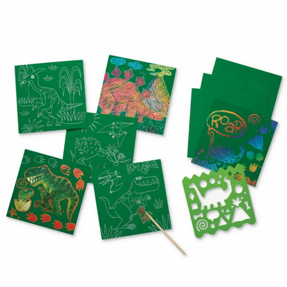 10 ark på 18×18 cm med dinosaurer og 5 ark uden prints til fri leg.