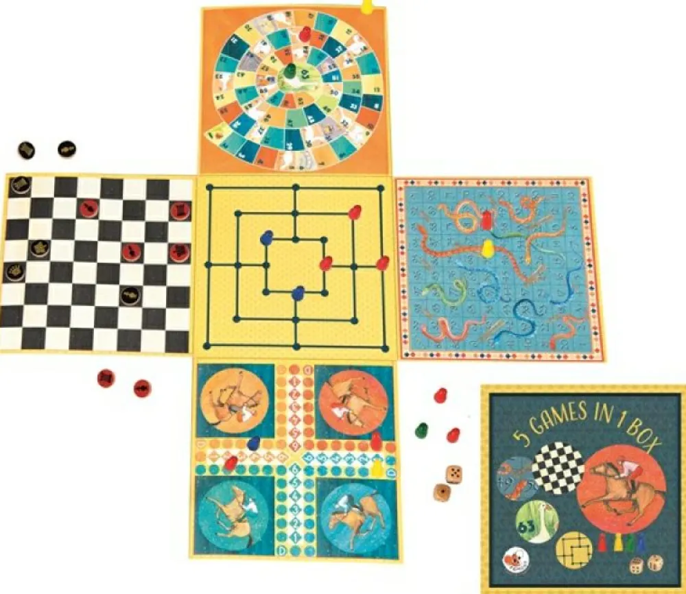 Regler (på 10 sprog) følger heldigvis med, hvis du heller ikke kender alle de 5 spil forfra og bagfra.