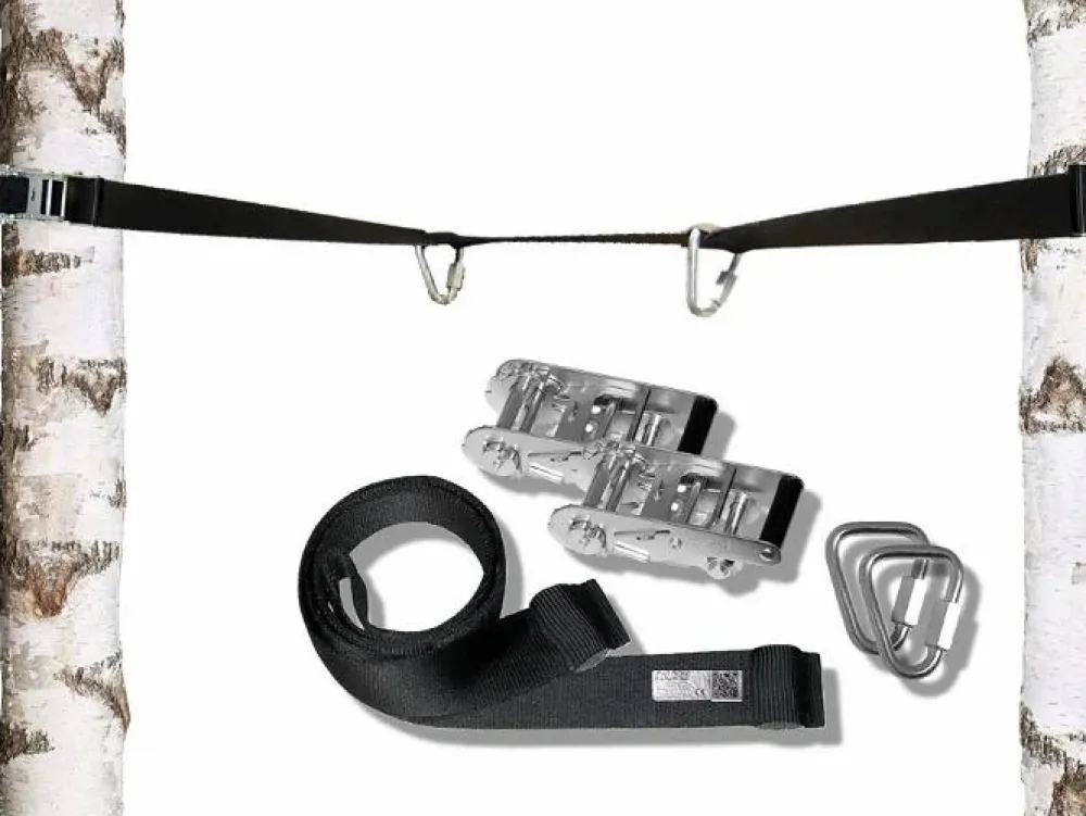 Der er to karabinhager og to spænder med i pakken, nok til en hængekøje eller en gynge ophængt på tværs mellem to træer. Hvis du vil hænge flere hængekøjer op i samme line/strop, så skal du blot tilkøbe flere karabinhager.