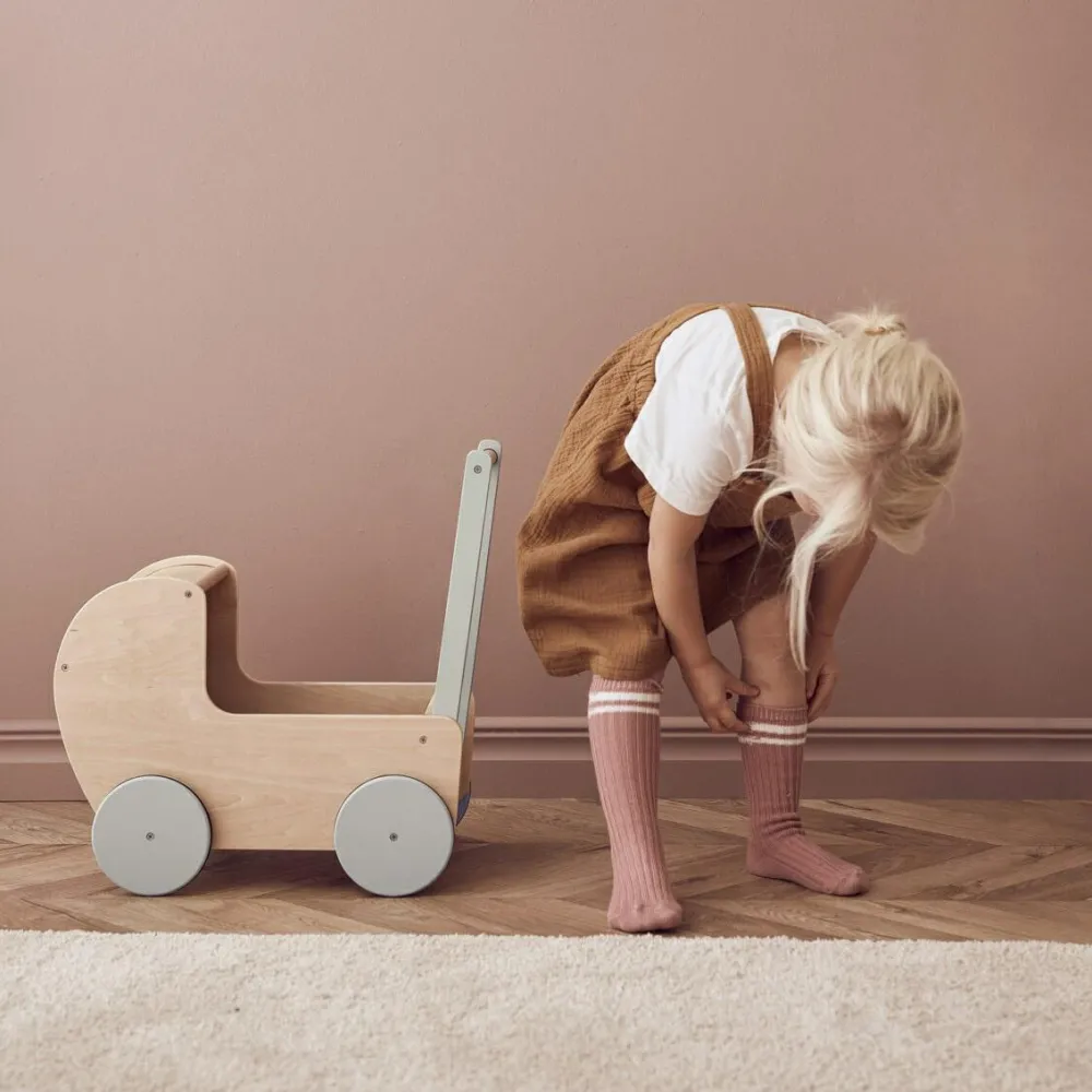 Dukkevognen har støjsvage gummihjul, så den kan køre ture indendørs uden at det ødelægger gulvene eller generer underboen.
