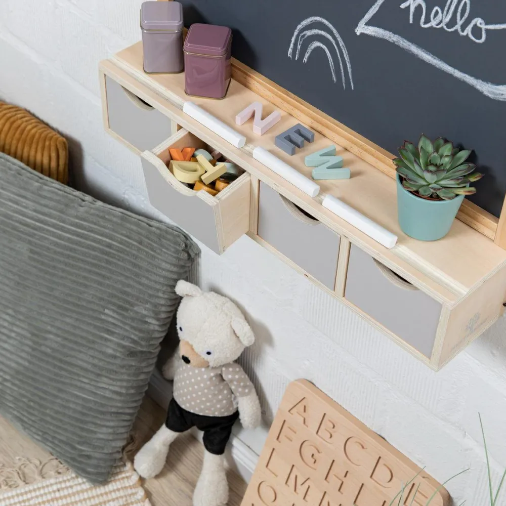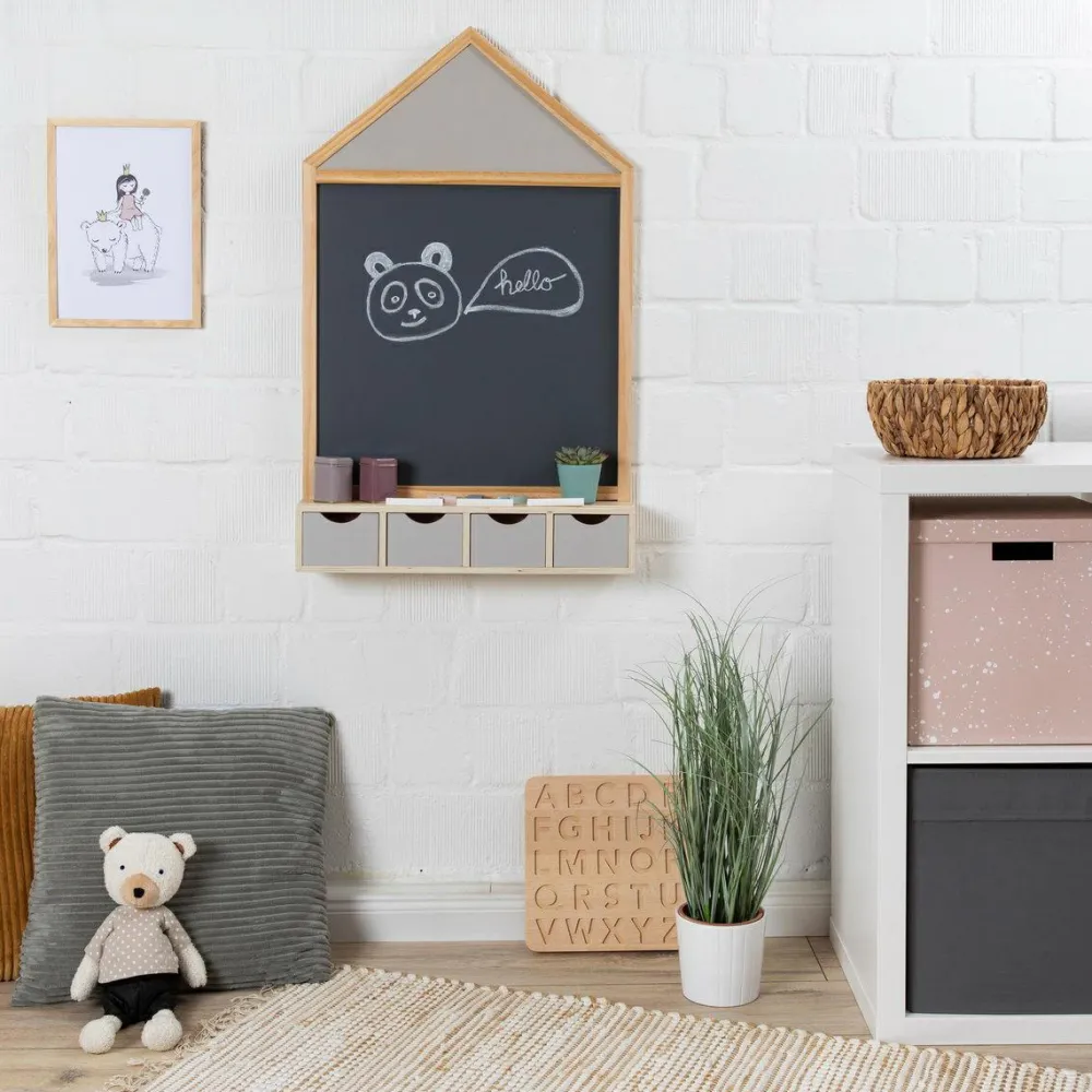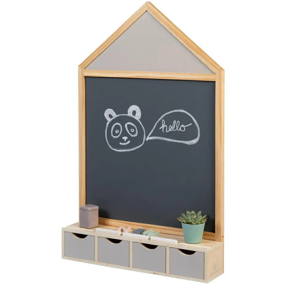 Fin og praktisk tavle formet som et hus og med plads til tegnekridt på hylden eller nede i de små skuffer. Så har kridtene deres faste plads og bliver ikke så nemt væk.