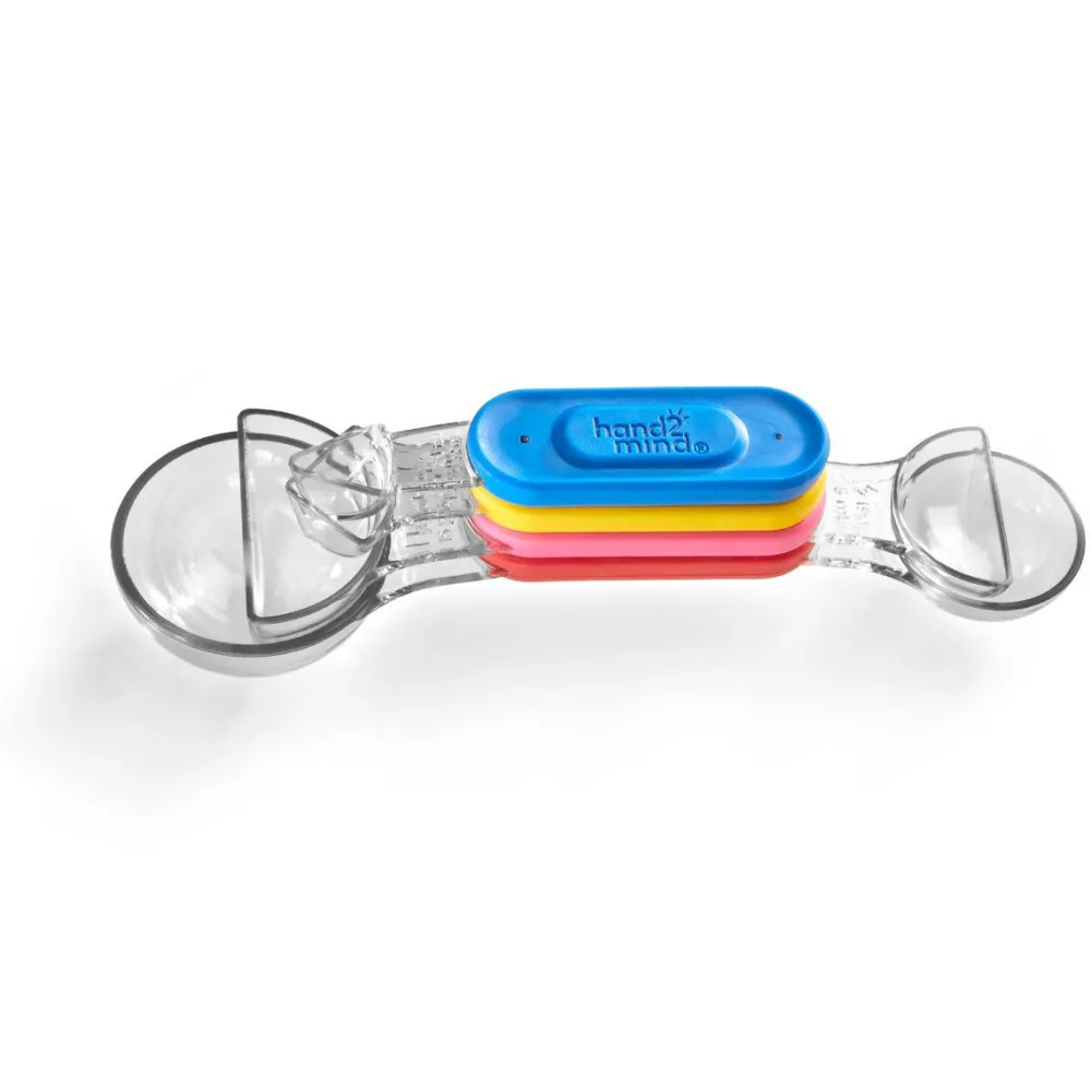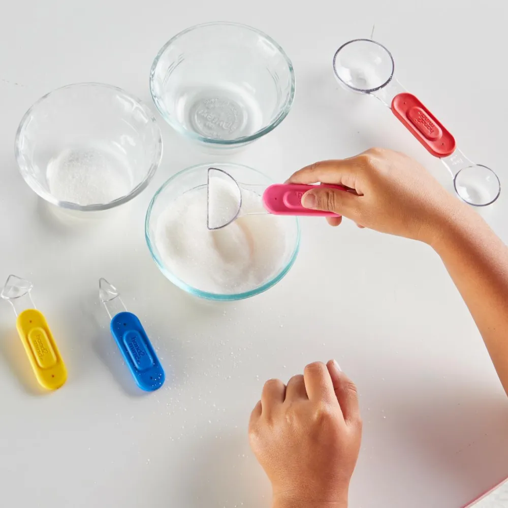 Med disse 4 måleskeer kan dit barn få en hands-on fornemmelse af brøker og hvor stor mængdeforskel, der eksempelvis er på 1/4 og en halv teske.