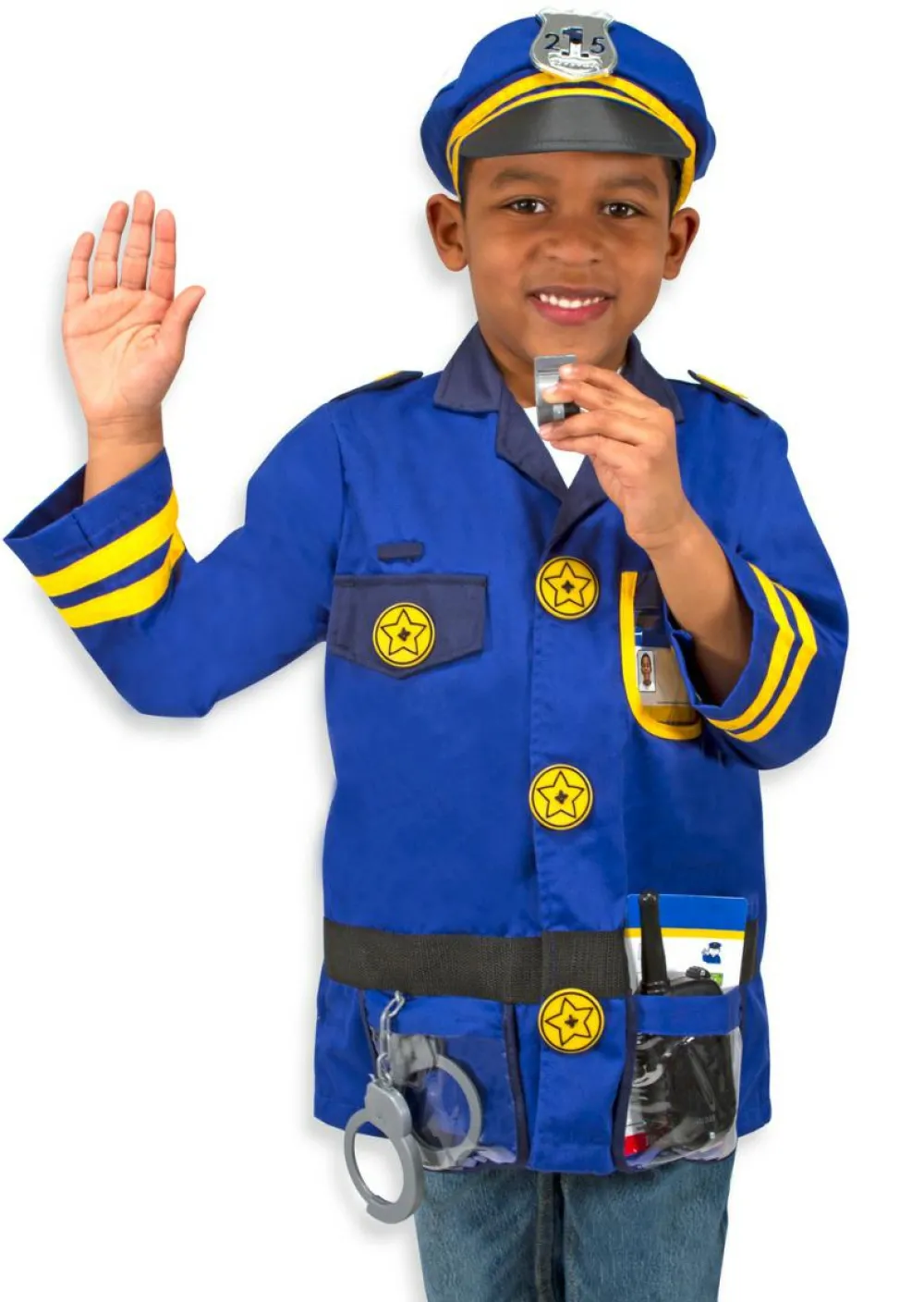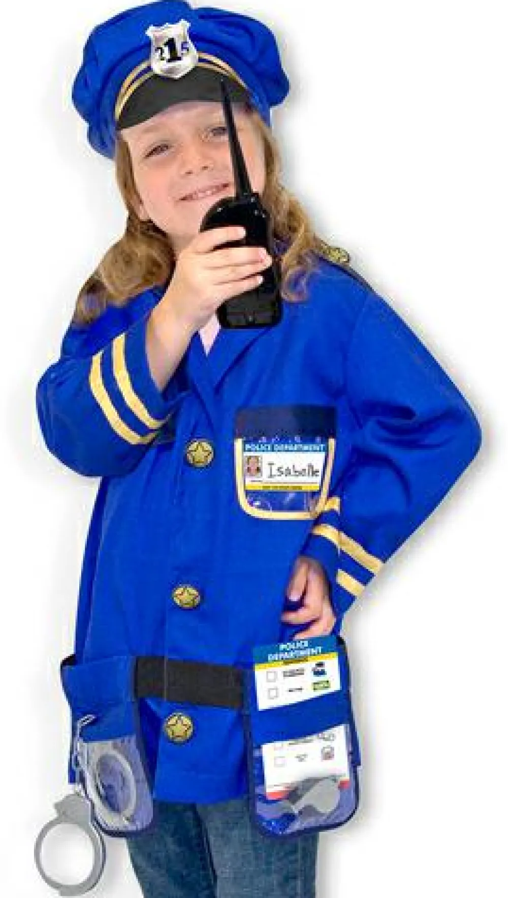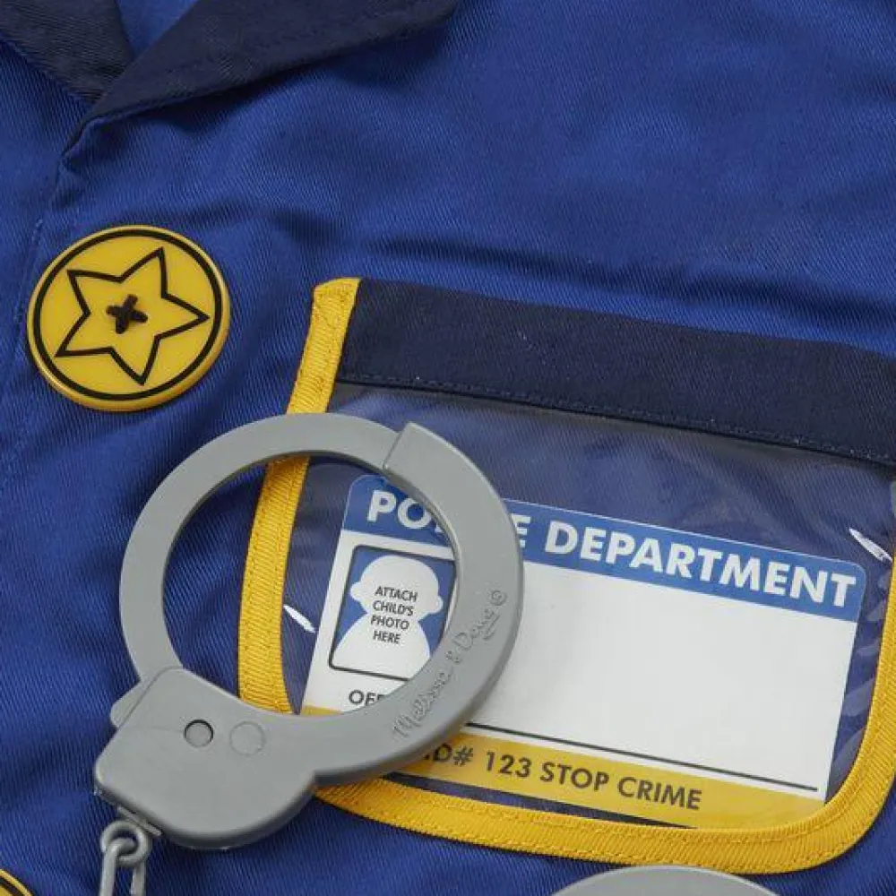 Kostumet indeholder: Jakke, kasket, politiskilt, fløjte, walkie-talkie (med lydeffekter), håndjern og navneskilt.