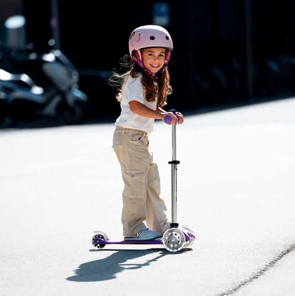 Flot og glitrende lilla løbehjul med dynamo-LED-lys i hjulene, der både er sjovt og giver ekstra sikkerhed i mørket.