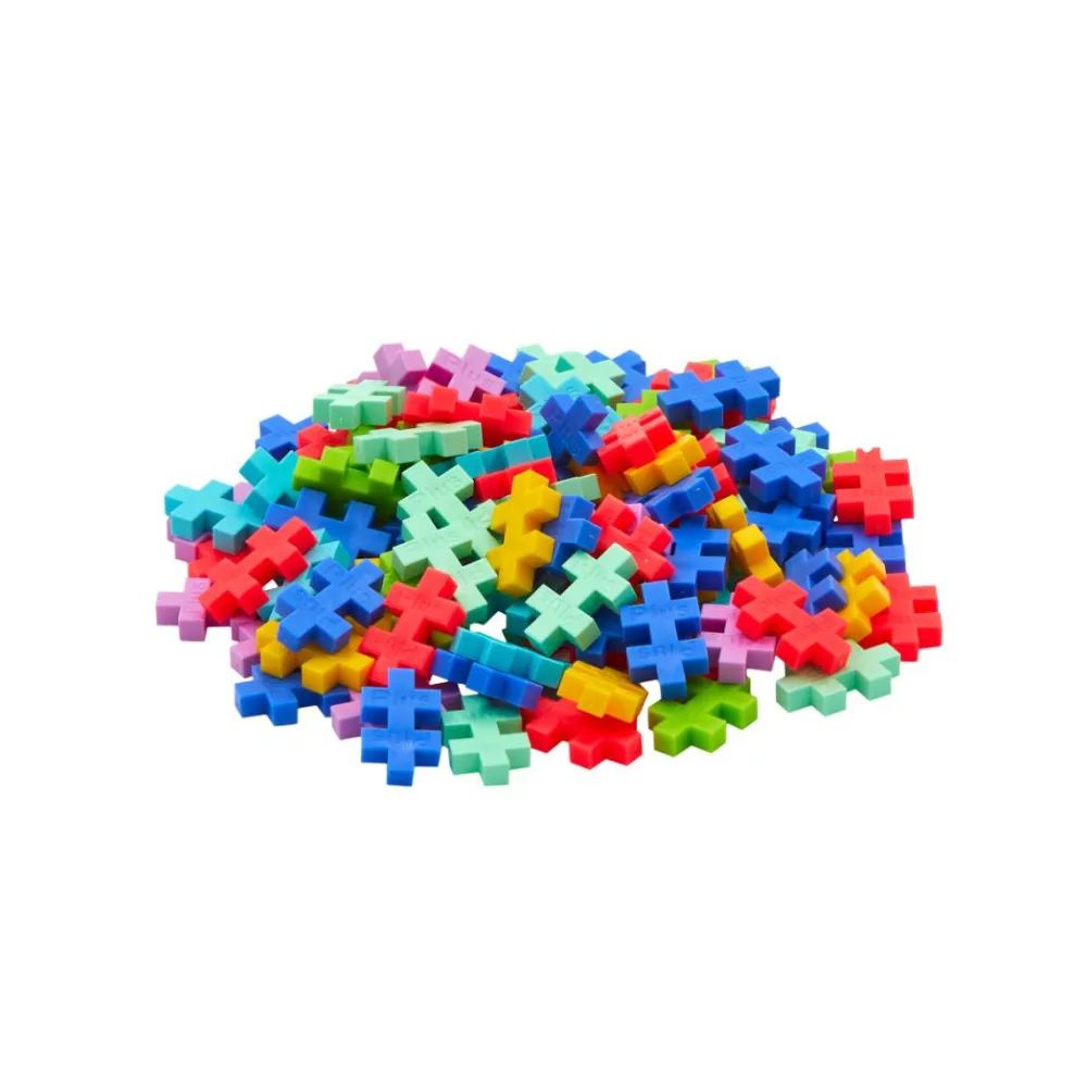 Brikkerne er formet som små plus-tegn og kan sættes sammen på alle leder og kanter – og de du kan vælge små (2 x 1,2 x 0,4 cm) eller store (5 x 3 x 1 cm) brikker i et væld af farver. Dejligt byggelegetøj, som de fleste børn elsker. Det understøtter dit barns forståelse for logik og geometri at lege med Plus-Plus. Idéer og grundige byggevejledninger til Plus-Plus kan du søge frem på fx YouTube.