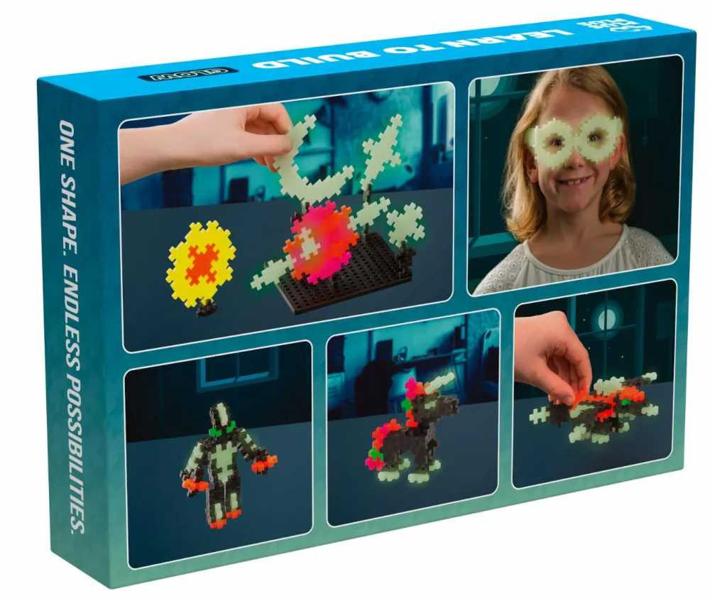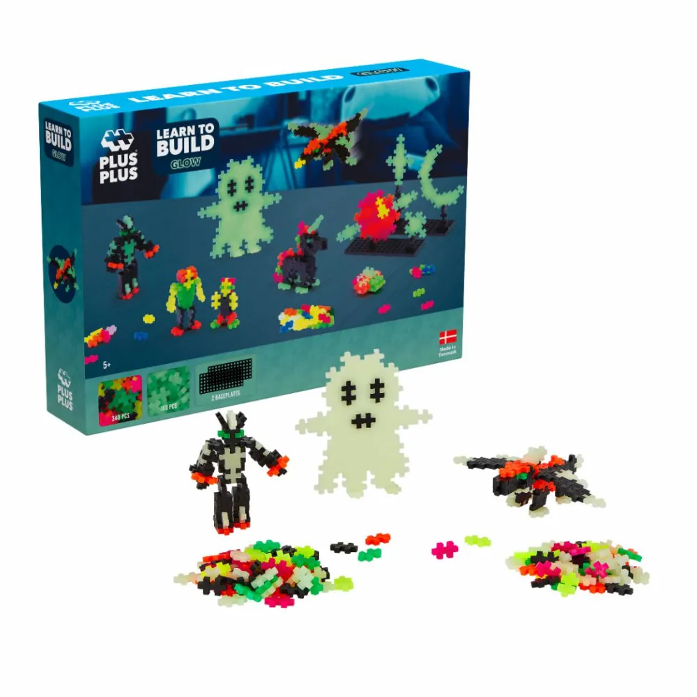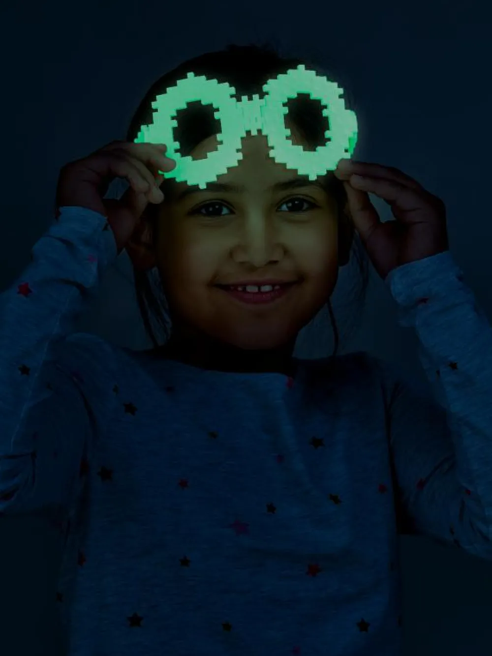 Her er 340 stk farvede og 160 ensfarvede Plus-Plusser, der lyser op i mørke.