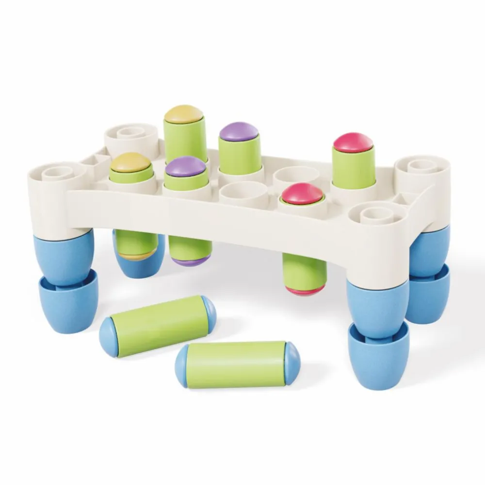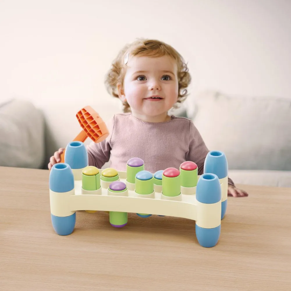 Flot hammebræt med pastelfarvede pløkker, som er herlige at hamre ned i brættet. Når det er gjort, er brættet lige til at vende, så legen kan starte forfra.