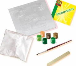 Med dette kreative sæt, kan dit barn støbe og dernæst male de forskellige dinosaurer, der er klækket, ved hjælp af den medfølgende gipsblanding og afstøbningsformene, som er i genanvendt plast.