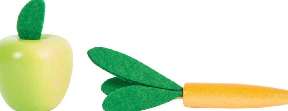 Æble, gulerod, 2 forskellige strigler, hovjern, kam, medalje, taske og strop.