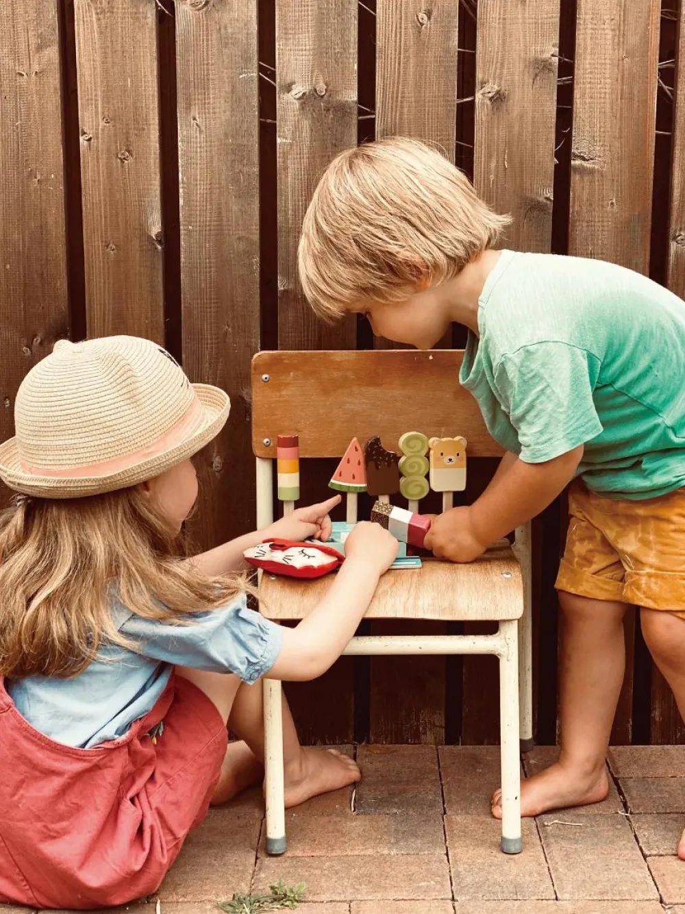 Så er isbutikken klar til at åbne med lækre is af træ, som aldrig drypper i sofaen.