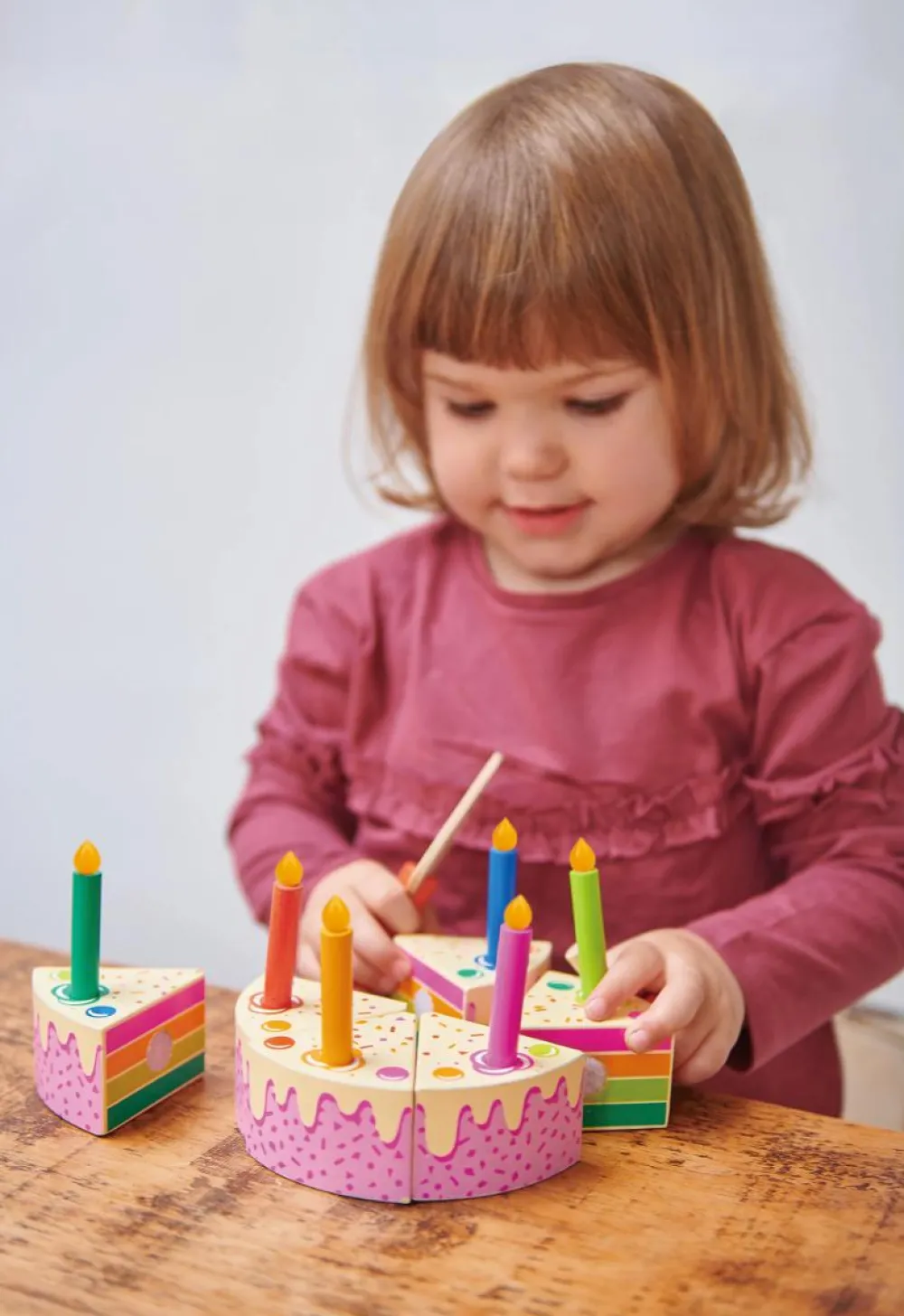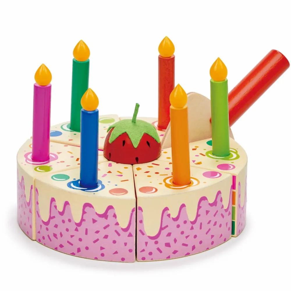 Stykkerne kan skæres fra hinanden med kniven – de sidder nemlig sammen med velcro. Lysene kan sættes i kagen og fjernes, når bamse har pustet og måske fået sunget fødselsdagssang.