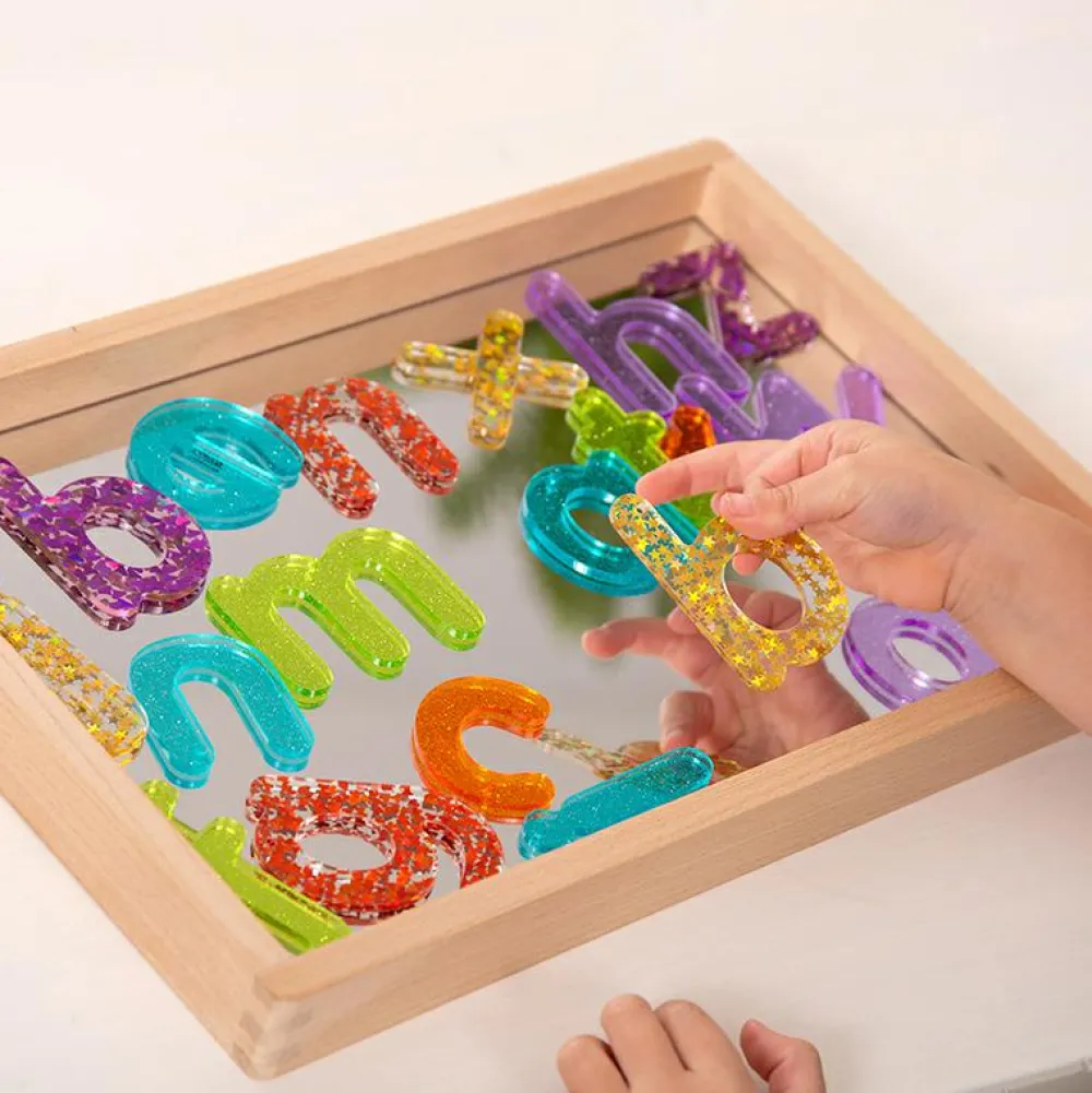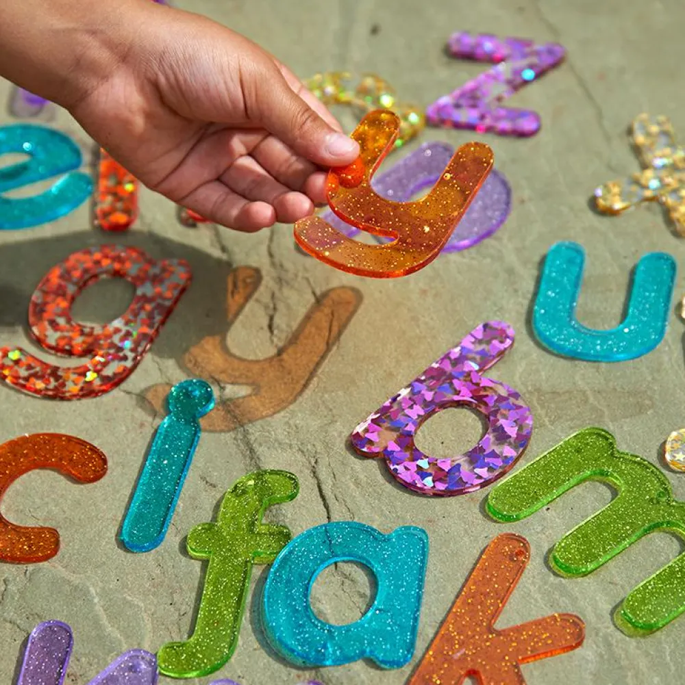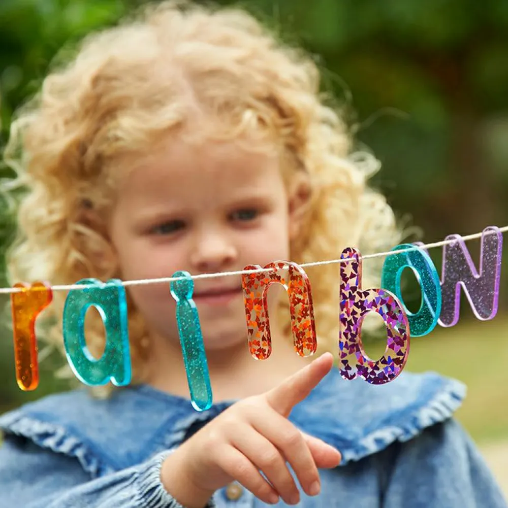 Flotte glitterbogstaver, som dit barn kan undersøge, hænge op, tegne efter og lære med.