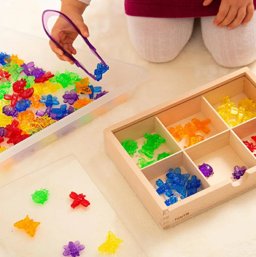 Her er mariehøner, sølvsmede, bier og sommerfugle i 6 forskellige farver, som dit barn kan hygge sig med at tælle med, lave regnestykker med, sortere og rumstere rundt med.