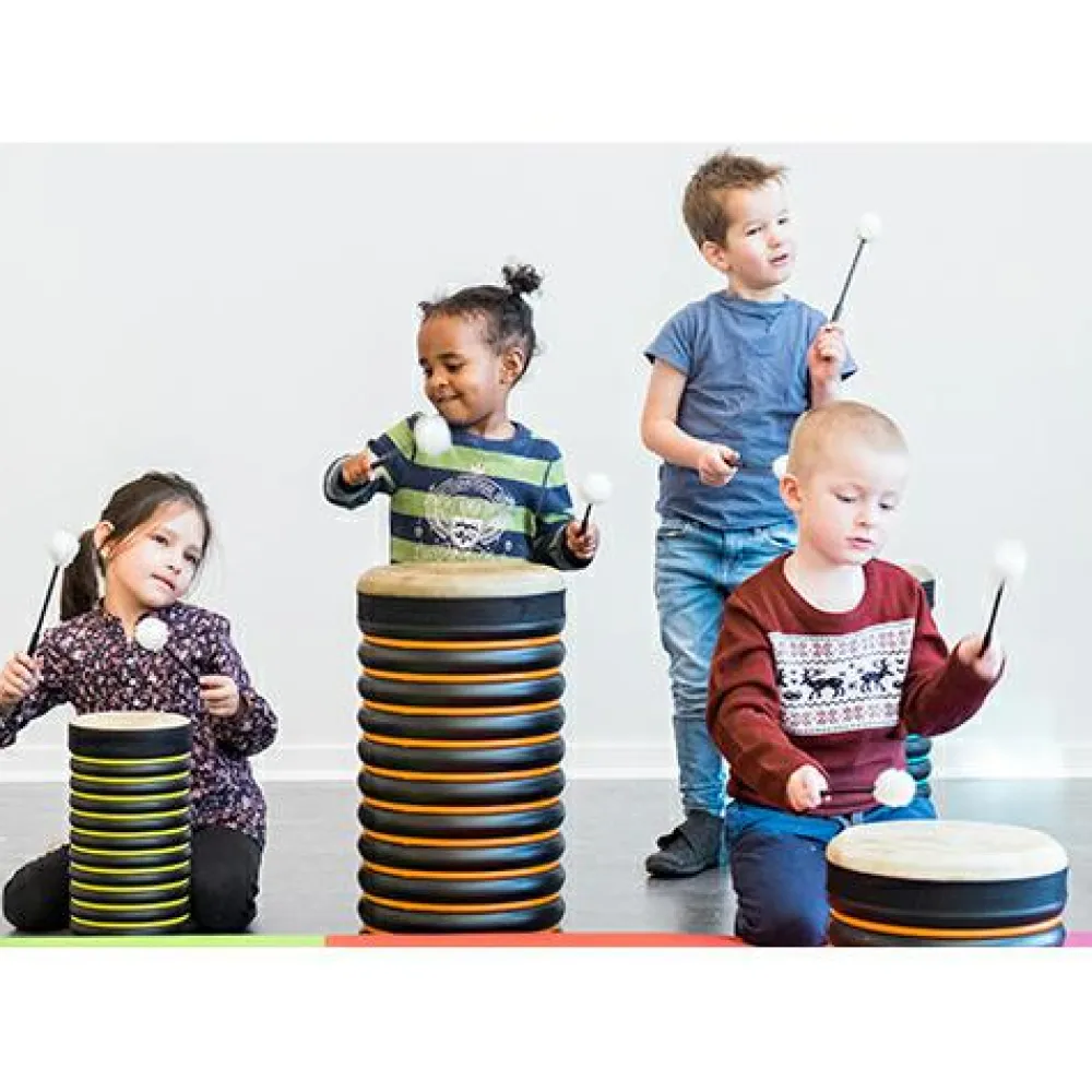 Rillerne på siden, som kendetegner denne serie, gør det lettere for dit barn at holde trommen mellem benene eller under armen, uden at den glider.