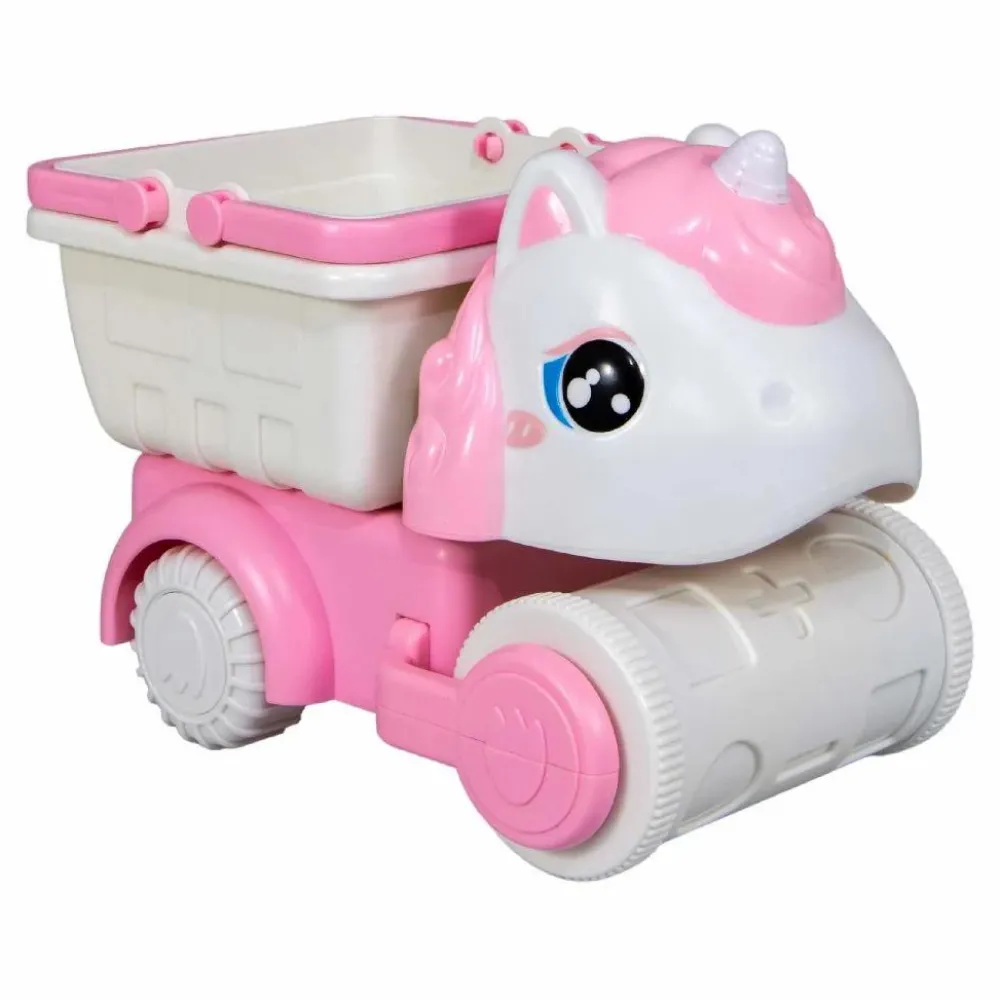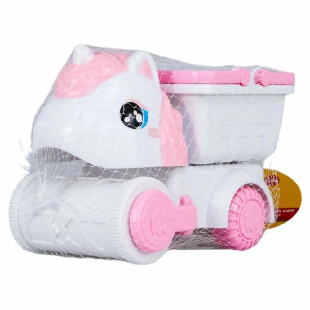 Sejt sæt, hvor dit barn kan bygge skovlen, rullen til at lave mønstre i sandet og den firkantede spandsammen så den bliver til en enhjørning-bil, som kan drøne omkring i sandet eller langs kanten af sandkassen. Det hele kommer i et net.