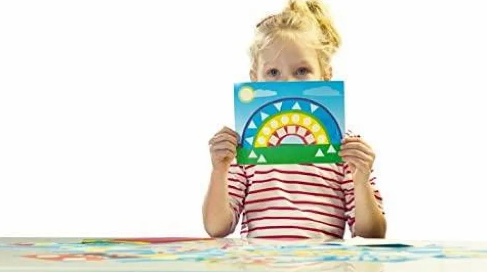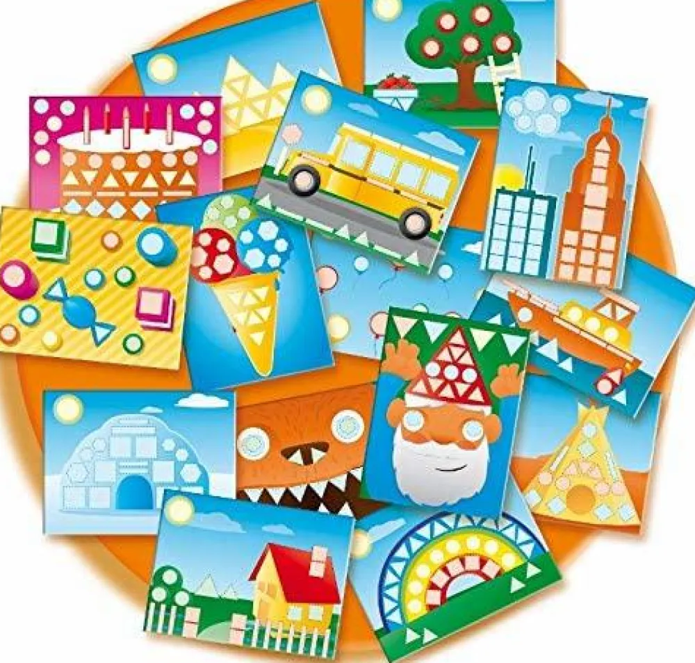 Her kan dit barn få stillet sin glæde ved klistermærker, samtidig med at I kan tale om forskellige geometriske former og farver.