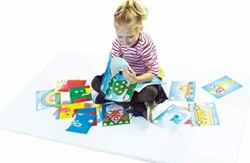 Dit barn skal nemlig vælge de rigtige former og farver på klistermærkerne, når de skal sættes de rigtige steder på motivkortene.