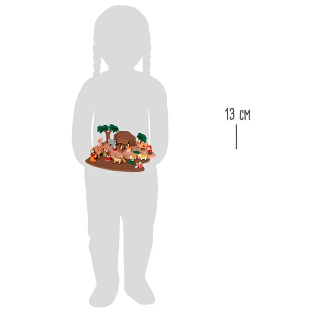 Figurerne er bl.a. Josef, Maria, det lille Jesusbarn, de tre vise mænd, hyrder, dyr i stalden, en engel og kameler, der er klar til fortælling af historier fra Biblen eller andre fortællinger.