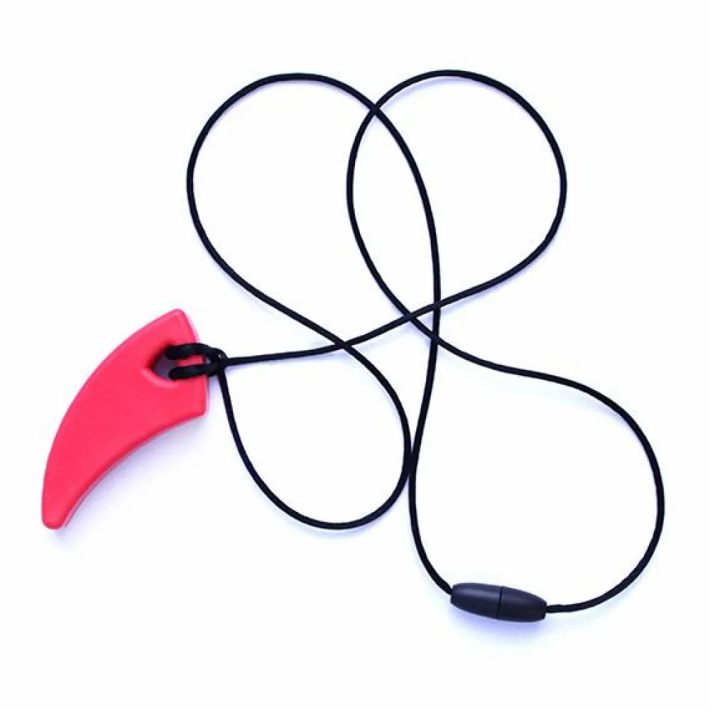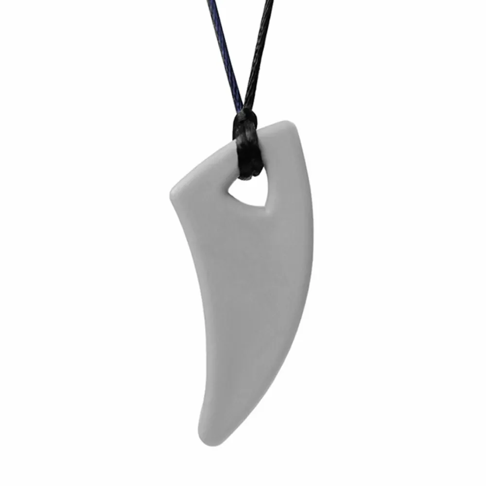 Om det er en sabel tand, en dinosaur tand eller en haj tand vil vi lade op til dig at afgøre. Denne udgave af et tyggesmykke er en for nogle lidt mere sej måde, dit barn kan stille sit behov for at tygge.