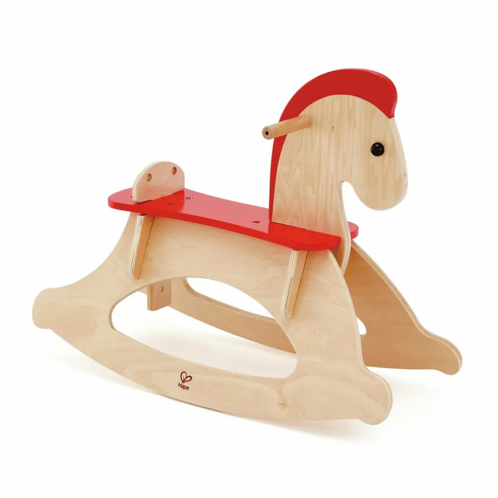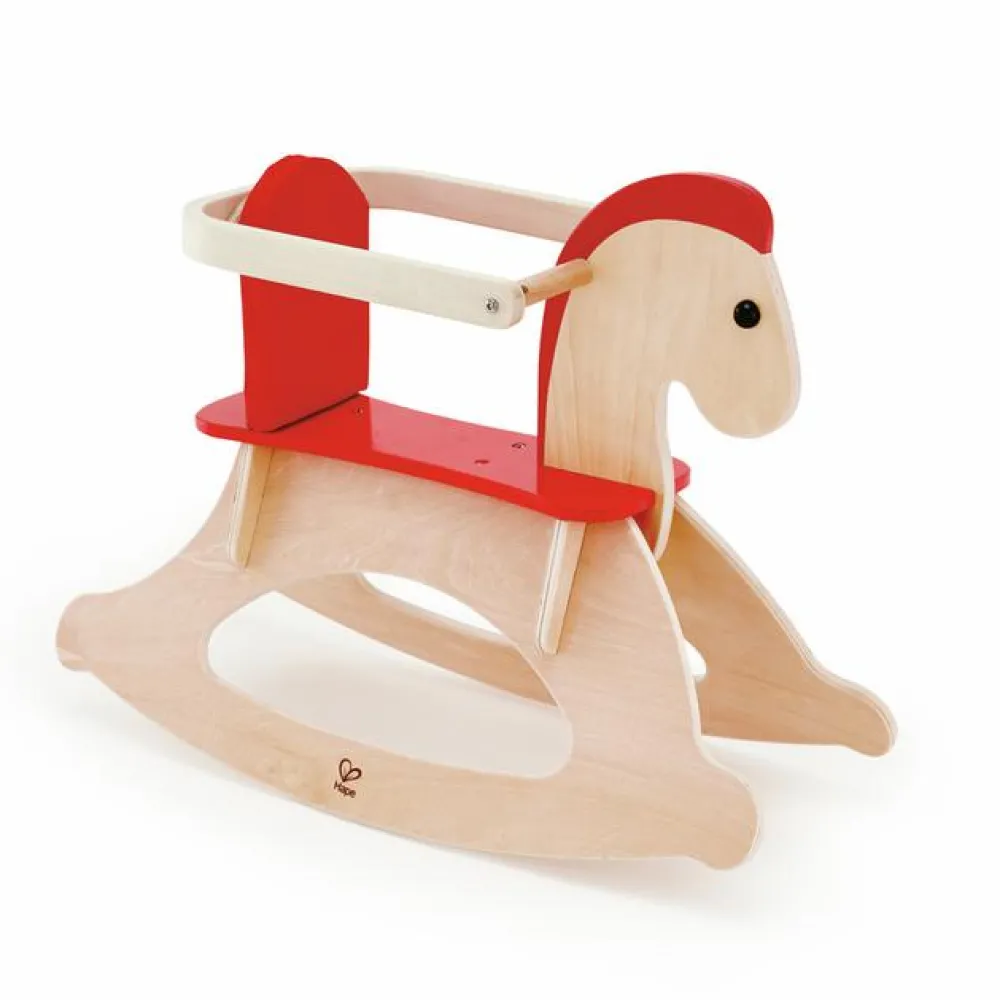 Det beskyttende værn i lyst træ kan tages af, når den lille sidder sikkert. Og ryglænet kan sænkes, så gyngehesten er sjov i flere år.