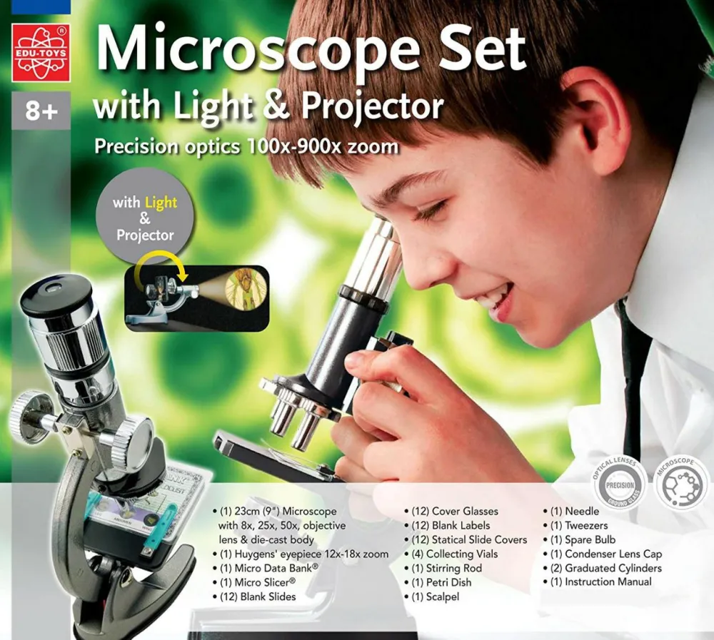 Metalmikroskop med lys, der kan forstørre op til 1200 gange i interval fra 100-200x, 300-600x og 600-1200x. Mikroskopet ligger i en smart kasse, der både kan bruges til opbevaring og til transport af mikroskopet, hvis I skal på ekspedition.