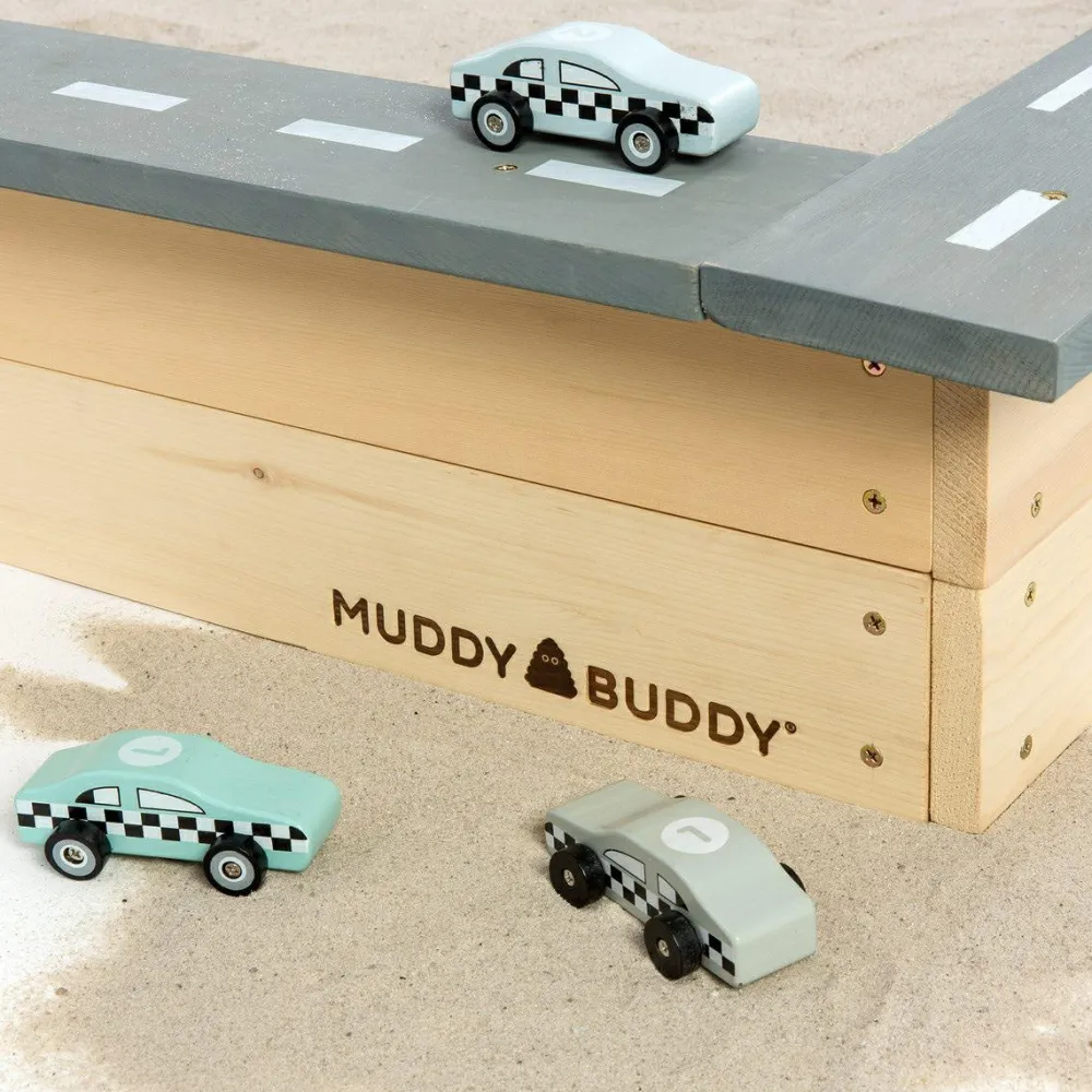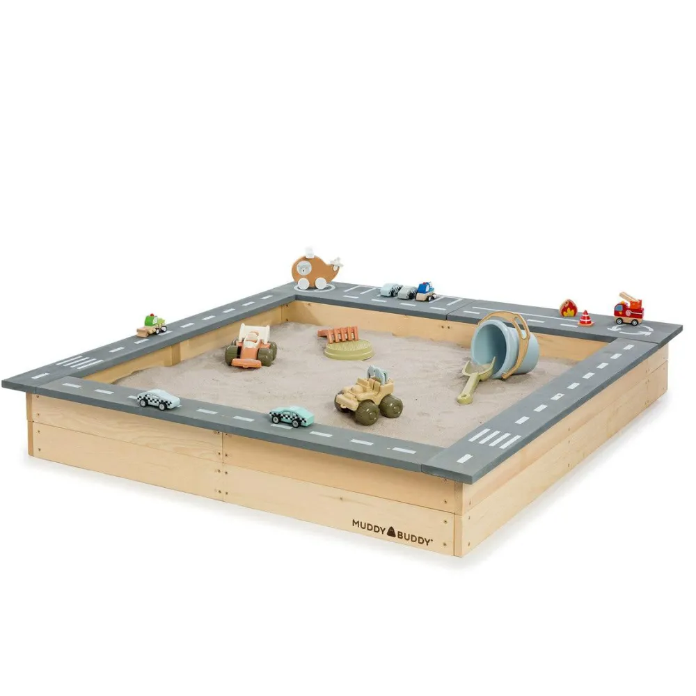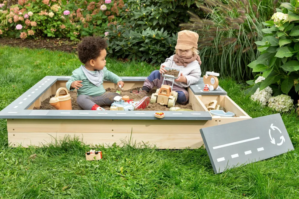 Dene geniale sandkasse udnytter kanten rundt til at være en kørebane for dit barns samling af biler. Med fine detaljer som fodgængerfelter, parkeringspladser og en rundkørsel.