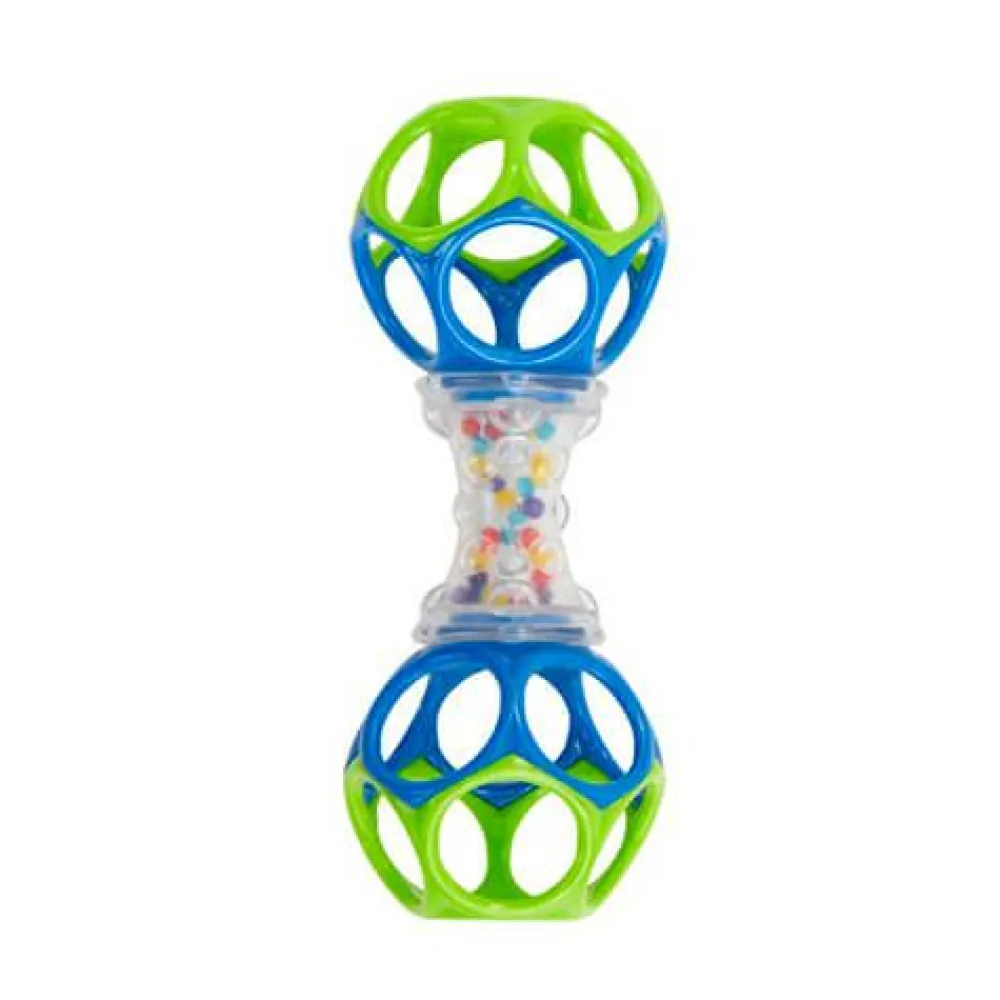Boldene er sjove og nemme at gribe fat i – også for små fingre. Og heldigvis kan denne Oball Shaker-rangle tåle at ryge på gulvet igen og igen og igen og …