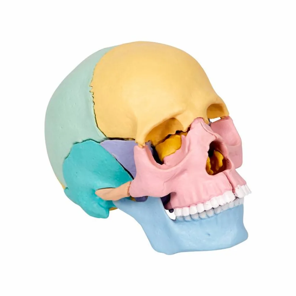 De 17 dele har fine pastelfarver og der medfølger 10 kort på engelsk, tysk og fransk med information om kraniets dele og hvordan de samles.