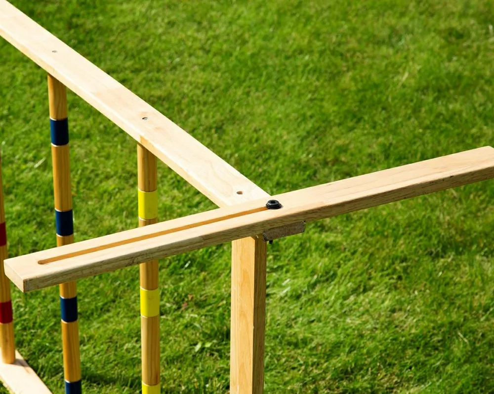 Stigen er fremstillet i lakeret gummitræ, og der medfølger 6 bolde.