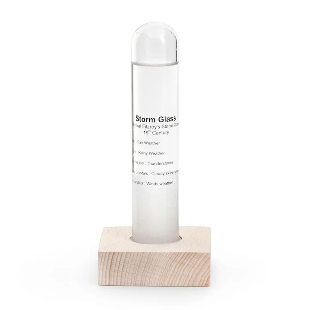 Dette stormglas benytter krystaller til at gisne om, hvordan vejret bliver. De opstår eller forsvinder simpelthen alt efter temperatur og lufttryk.