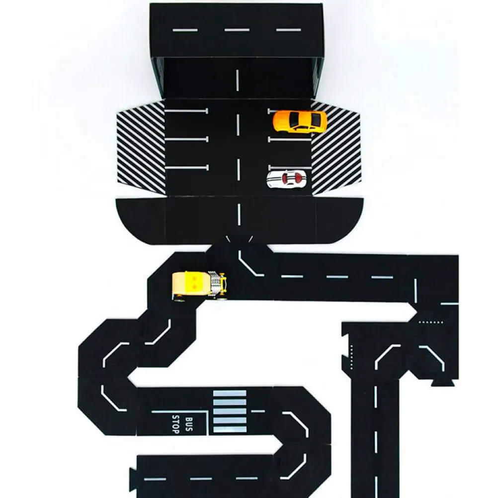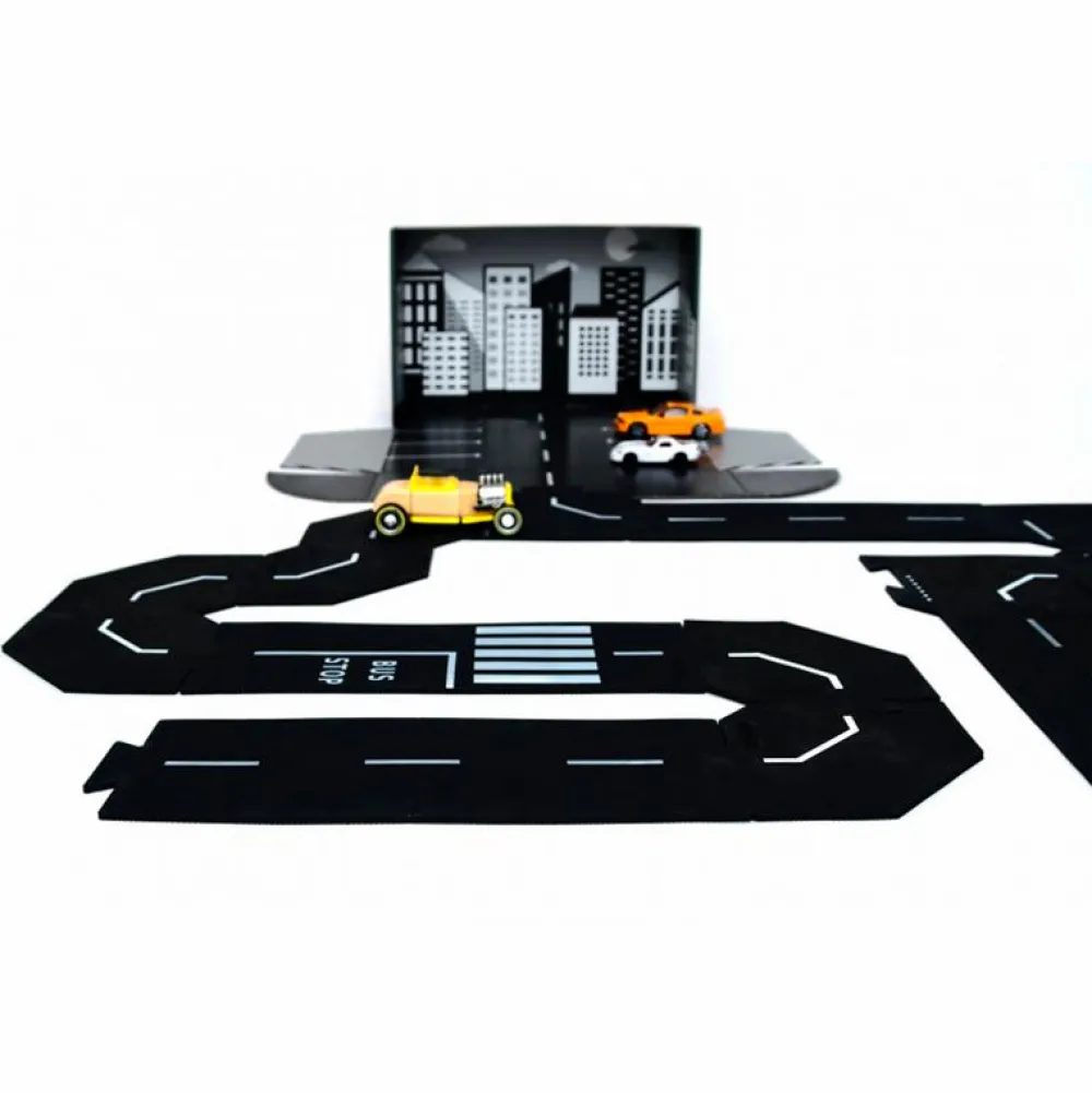 De sorte vejbaner med fine detaljer er af fødevaregodkendt silikone og æsken, de kommer i, er printet indeni, så den kan bruges som en del af dit barns leg og være parkeringsplads for dit barns biler.