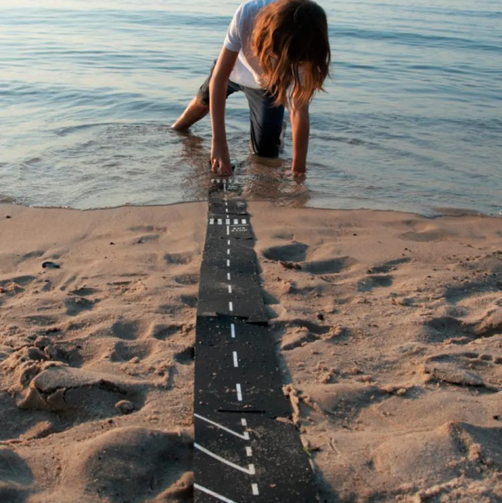 Den sorte farve gør, at det er let at se, hvis vejbanerne bliver støvede. Men så kan du simpelthen bare vaske dem i opvaskeren. Det kan de sagtens tåle og de hvide vejstriber, fodgængerfelter og andet skal nok blive siddende. Sørg for at tørre delene grundigt inden du lægger dem væk, hvor de ikke fylder meget.