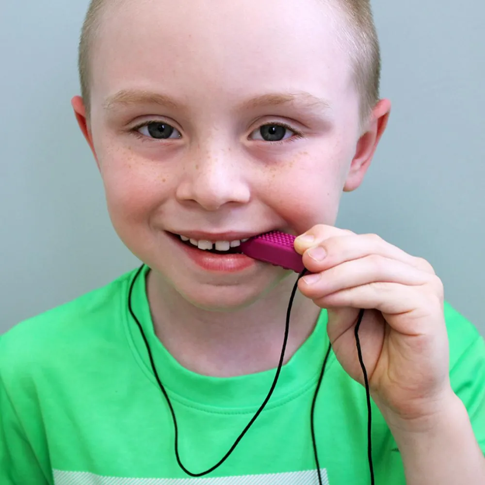 Nogle børn tygger, gumler og sutter for at berolige nervesystemet via de mange såkaldte receptorer i mundhulen og i tandrødderne. Det er ikke farligt, men hvis du gerne vilskåne puder, blyanter og bluseærmer, så kan et sensorisk tyggeredskab være et forslag. Disse redskaber er en fællesbetegnelse for tyggehalskæder, bidesmykker, bidelegetøj og vibrerende redskaber til børn, der har så stærk trang til at tygge i noget, at at de behøver særlige redskaber. Vores tyggeredskaber er sikre at anvende og hygiejniske.