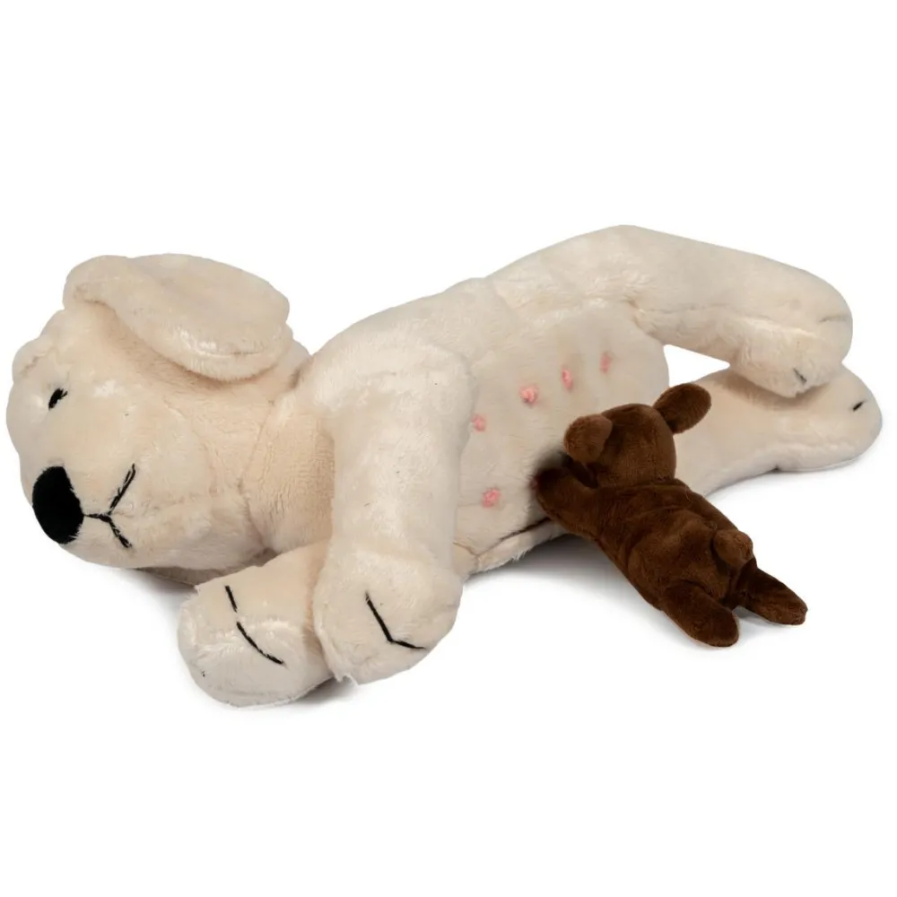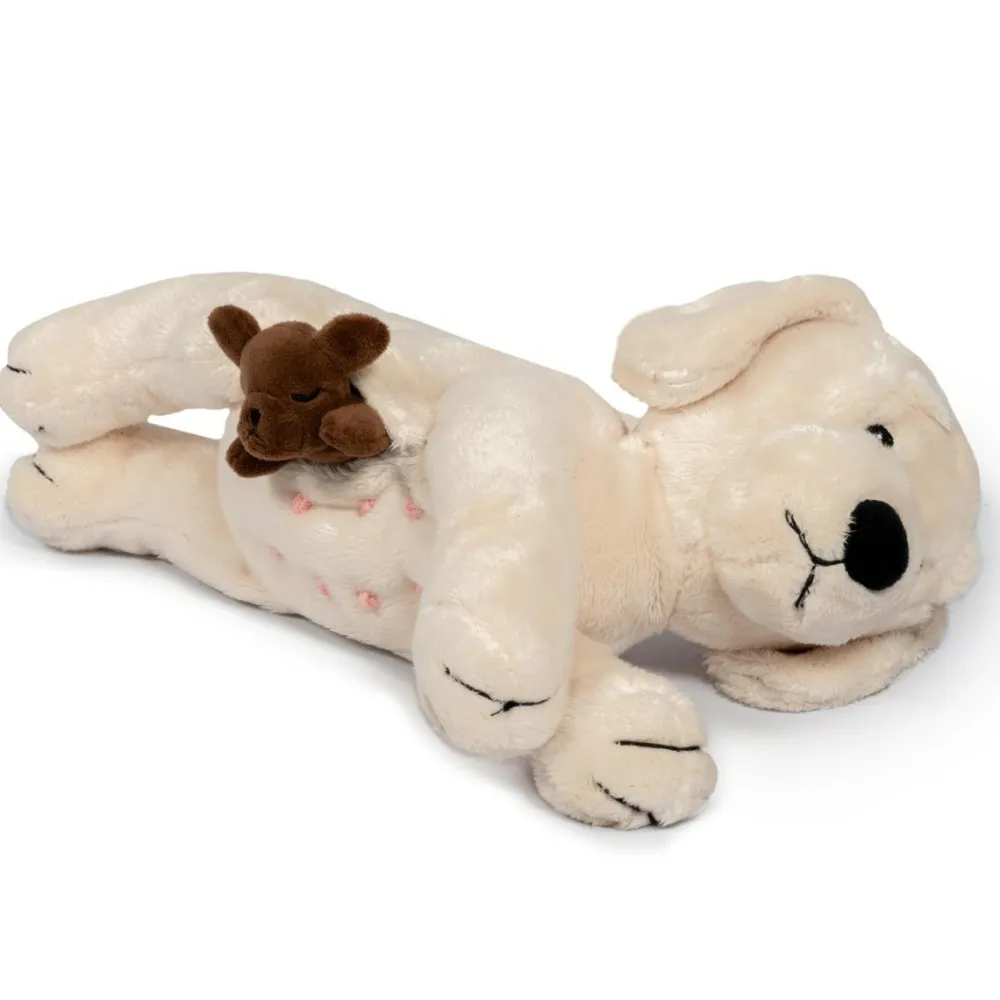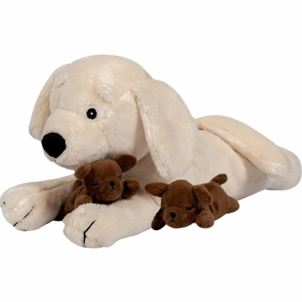 Kær og omsorgsfuld lys vovse med to chokoladefarvede hvalpe.