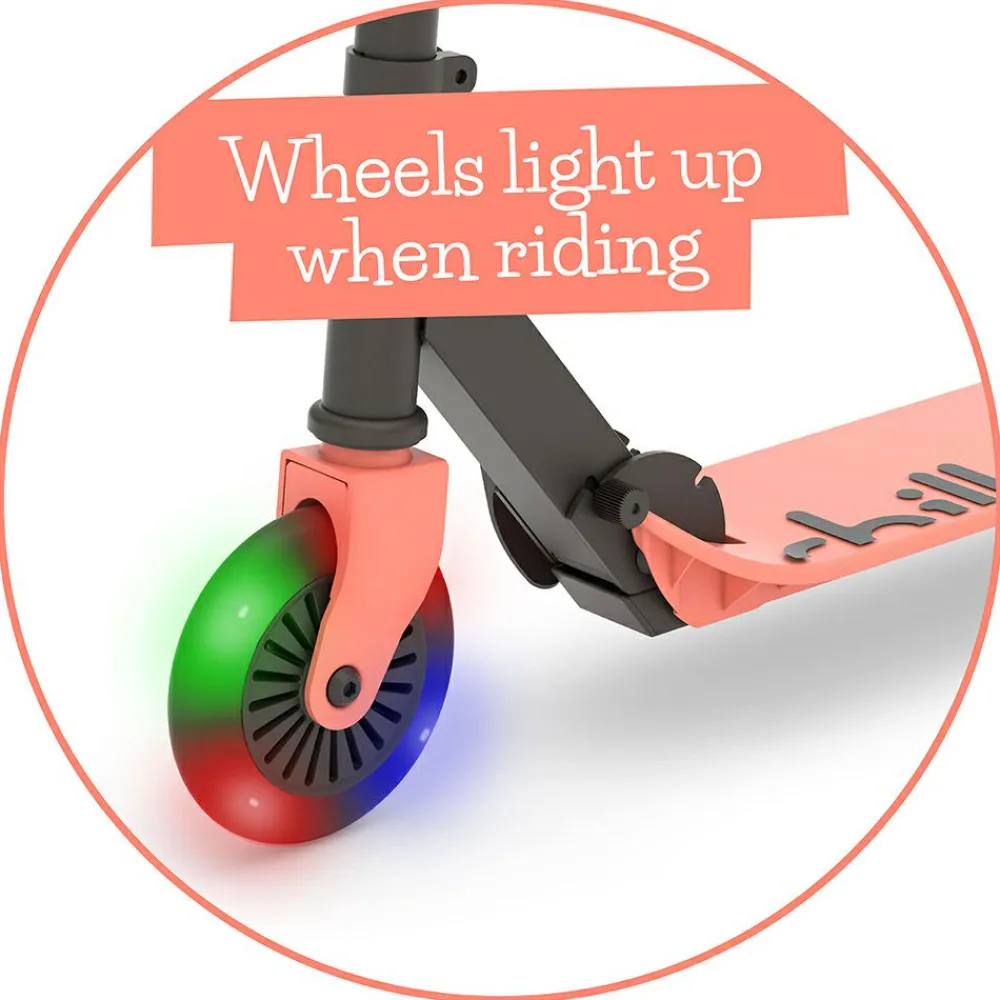 Sejt løbehjul, som er nemt at folde sammen og tage med ind i skolen eller med i bussen eller smide om i bagagerummet. Og så har det LED-lys i hjulene som en ekstra sjov detalje, der sikrer at løbehjulet oså er spændende i det mørke vinterhalvår.
