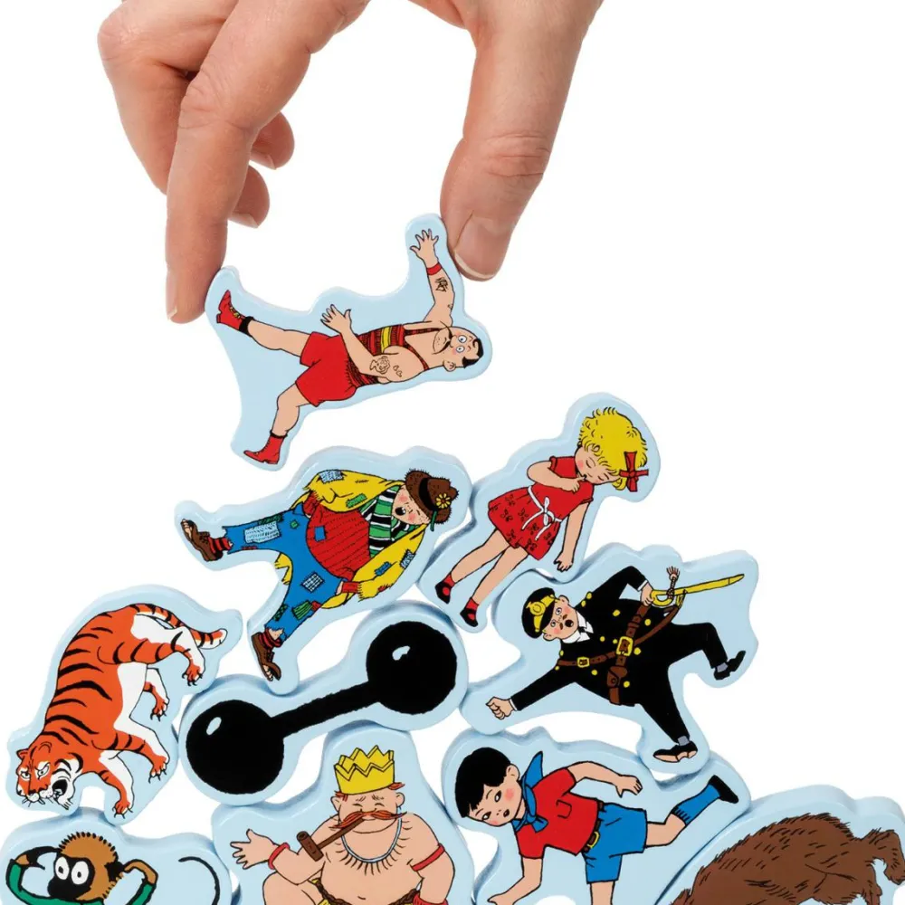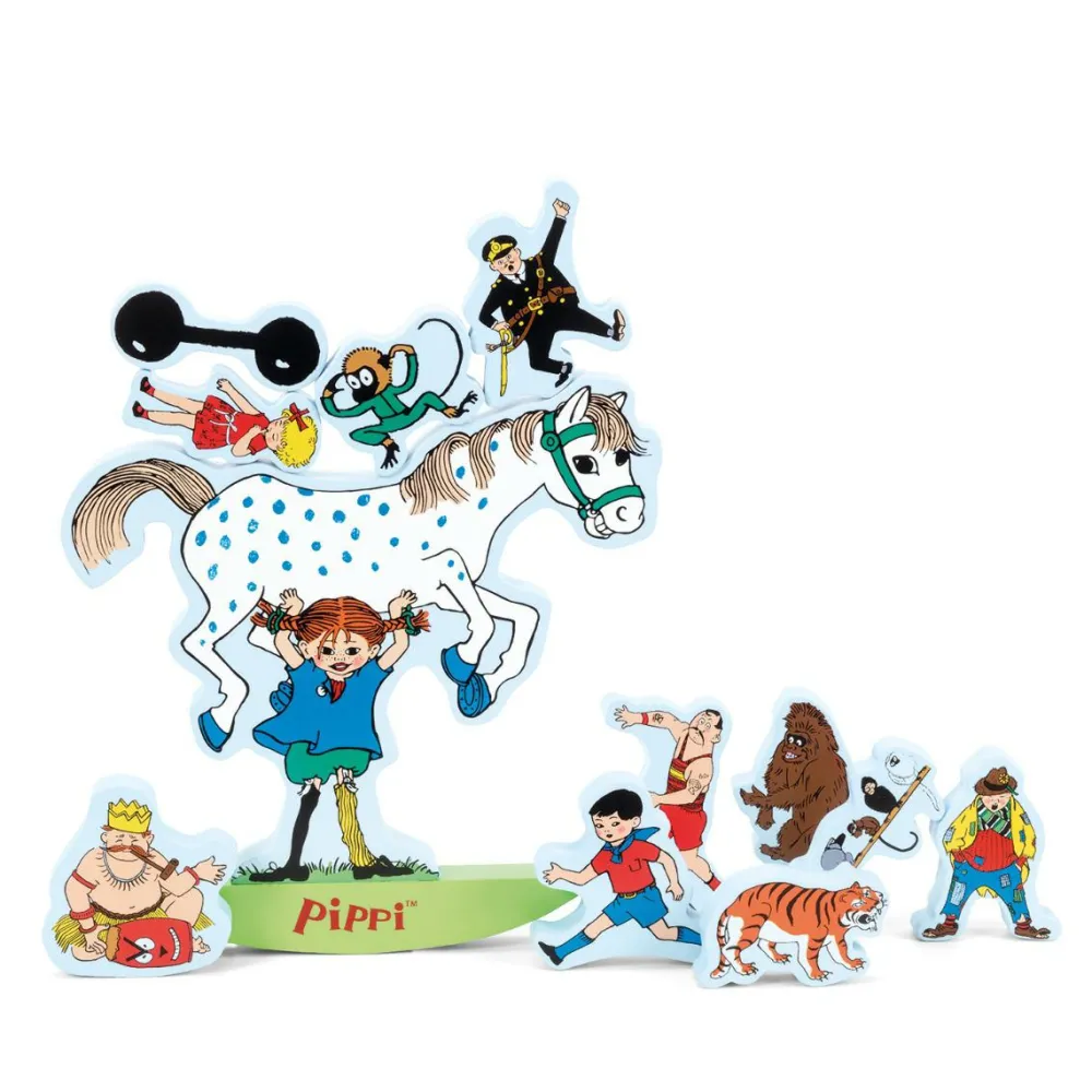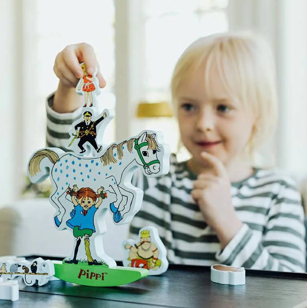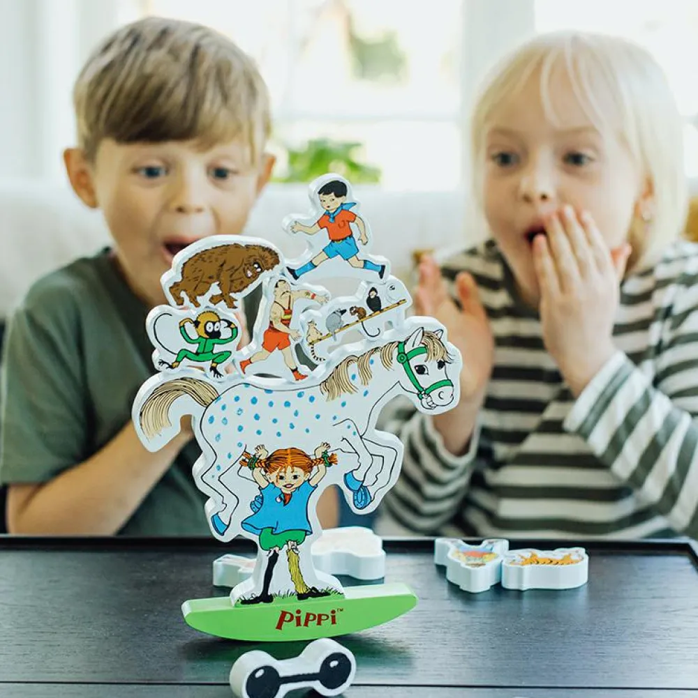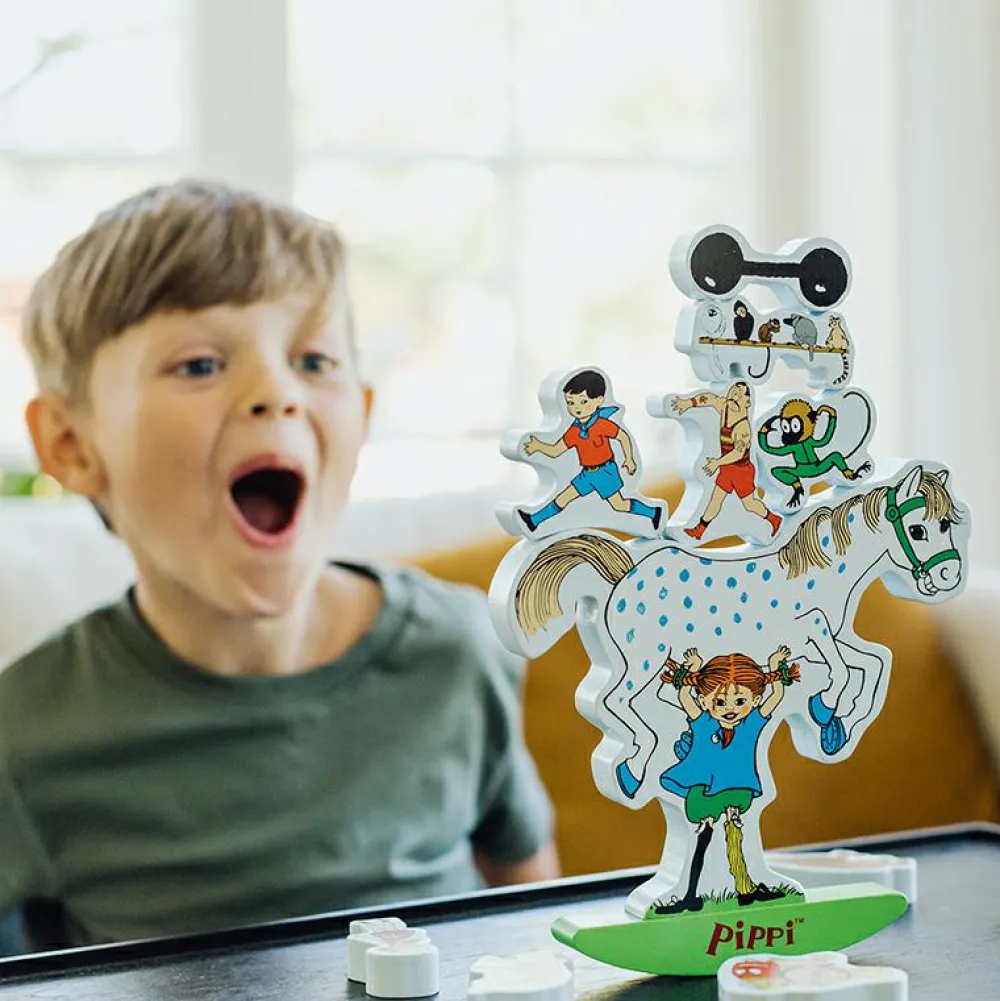 Pippi er jo verdens stærkeste pige, så for hende er det ingen sag at bære både hesten, Tommy, Annika og Stærke Adolf. Men er hun også god til at balancere dem, så de ikke dratter af?
