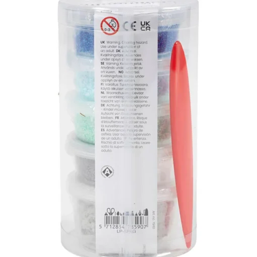 Indhold: 4 x 14 g Foam Clay® i blå, lyseblå, turkis og grå og 100 g Stone Clay, som indeholder stenpulver som giver massen en stenet finish.