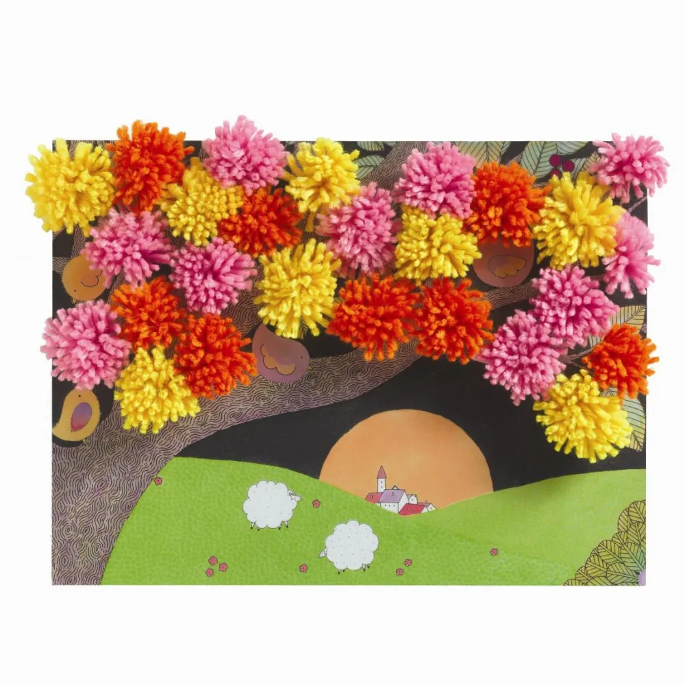 I får 4 store kort på 17 cm, der trænger så vældigt til pomponer lavet af dit barn. I får garn i forskellige farver med i æsken. Og I kan sagtens bruge garnrester, hvis I har noget liggende fra gamle hækle/strikkeprojekter/krea-projekter.