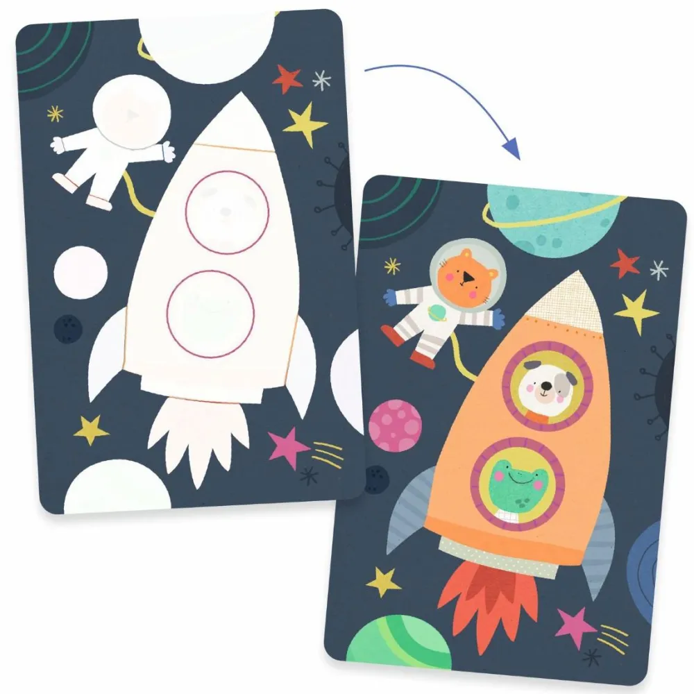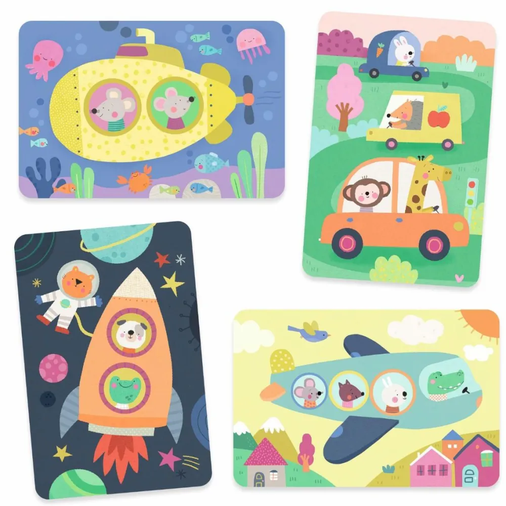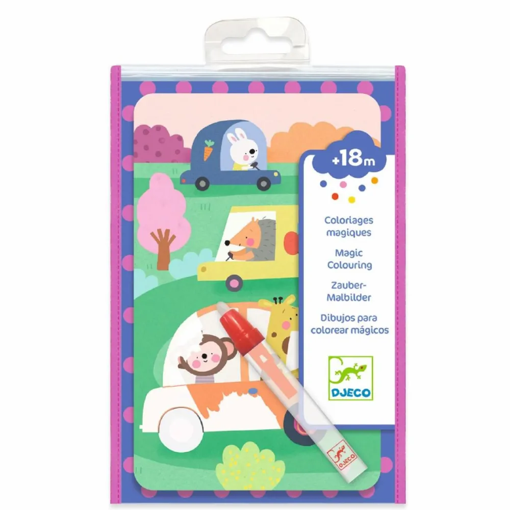 Dette sæt har transport-tema, og det består af 4 kort, en pen at fylde vand i samt en smart æske til hele molevitten.