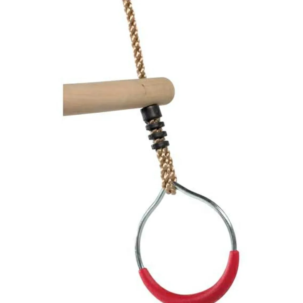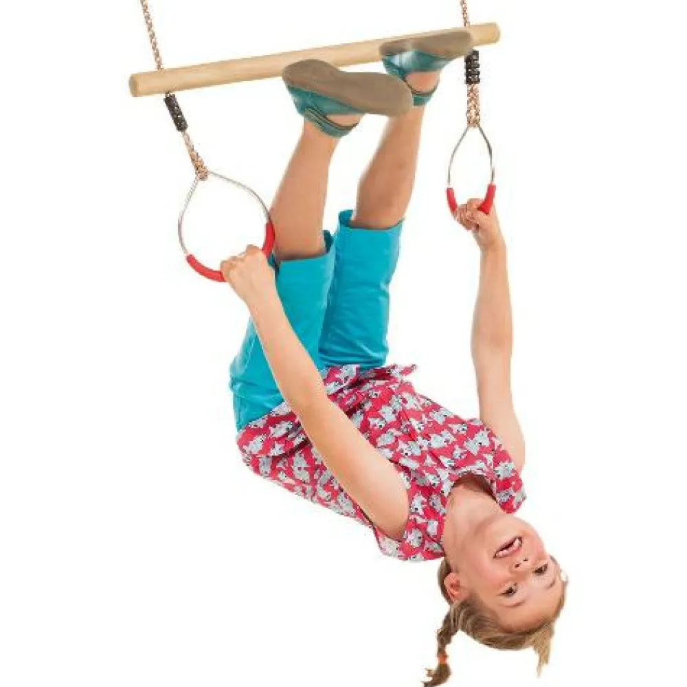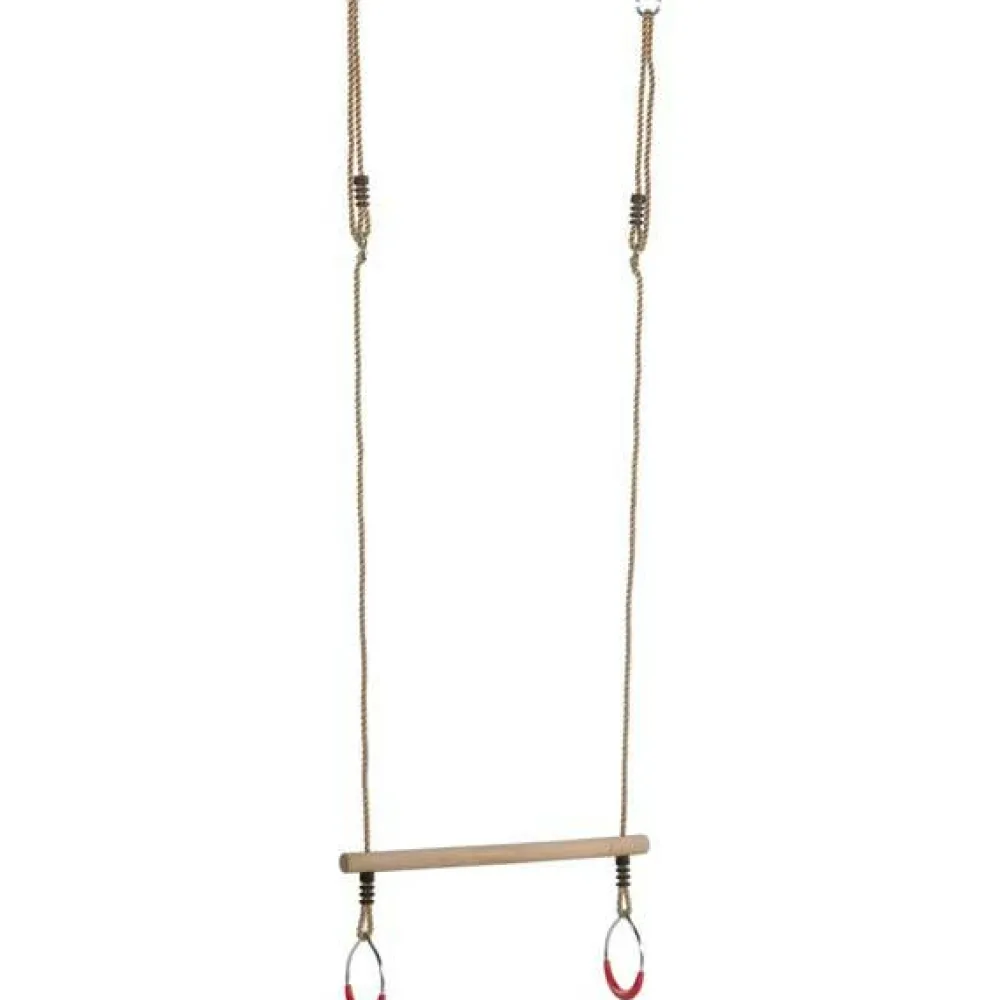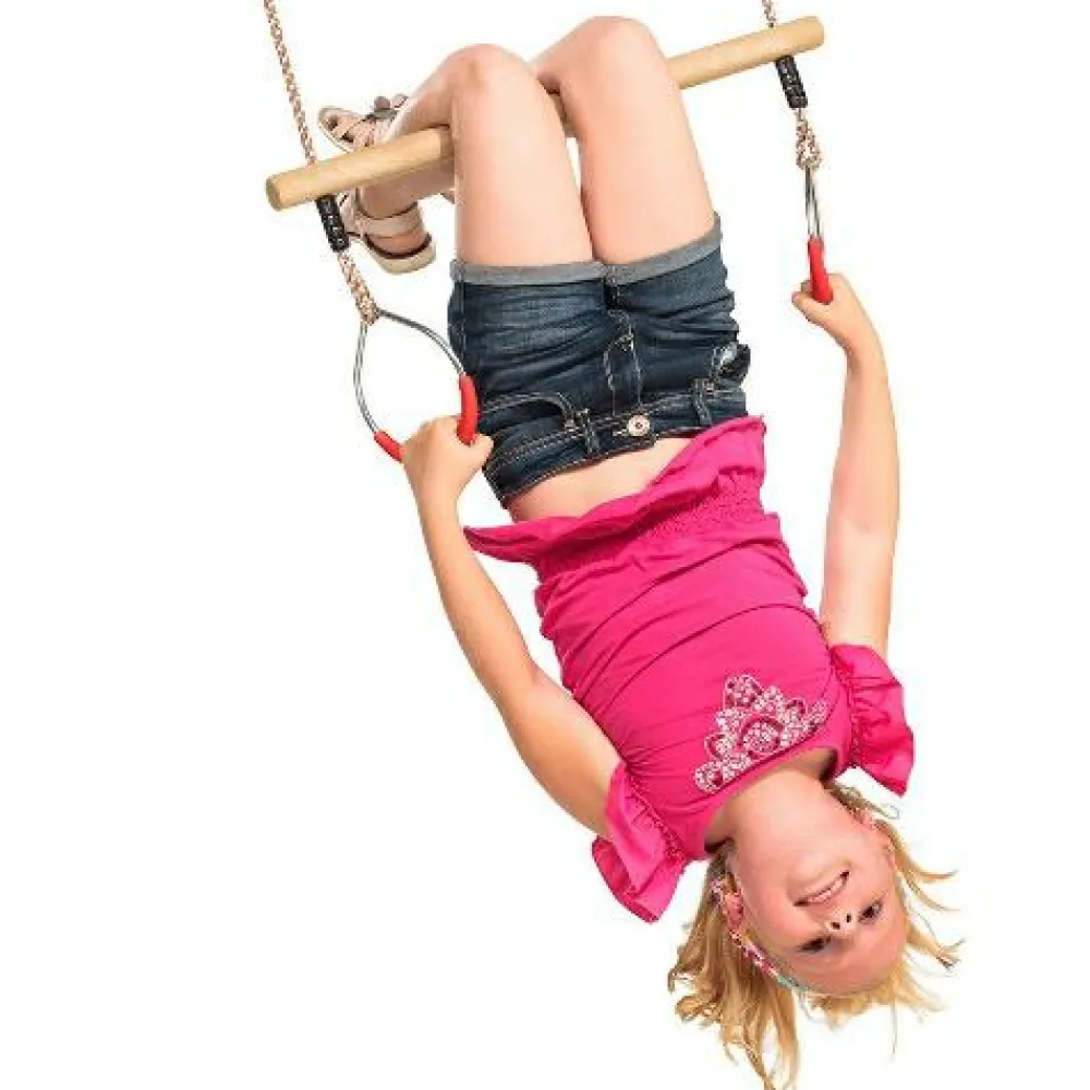 Der medfølger justerbare reb med ringe i til ophængning. Ringene er i galvaniseret stål med gode greb i plast og trapezen i træ. Hæng trapezen op i begge ringe hvis det skal gynges almindeligt, eller hæng begge reb i en enkelt krog for at få trapezen til at snurre om sig selv og giv barnet en snurretur.