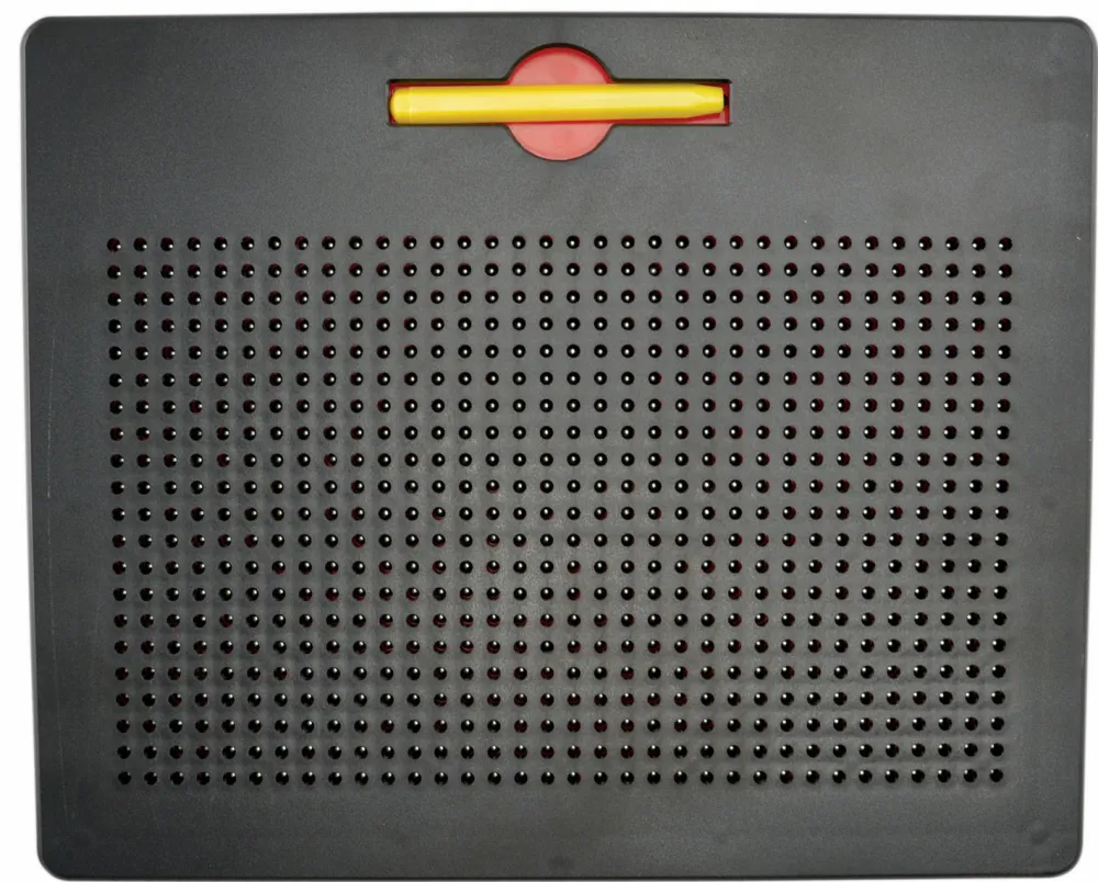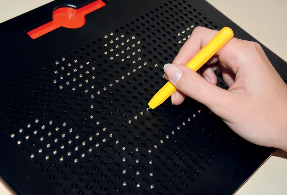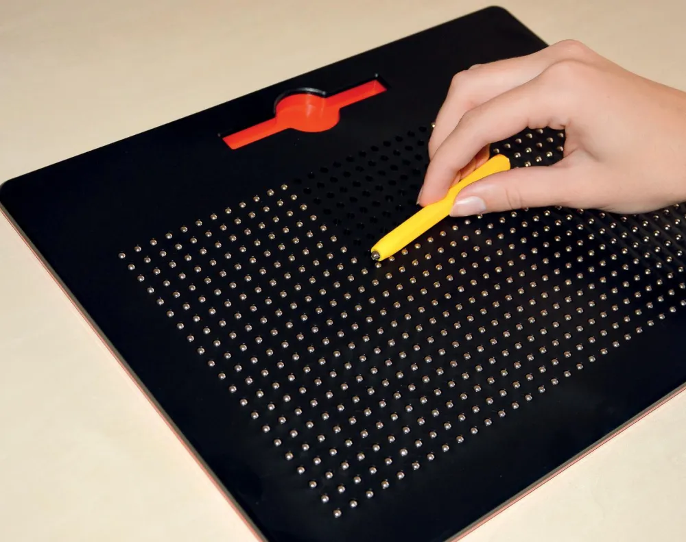 Tegn på denne magnetiske tegnetavle ved at trække de små magnetkugler frem med magnetkuglen. Når du vil “viske ud”, skal du bare prikke kuglerne tilbage ned i hullerne.