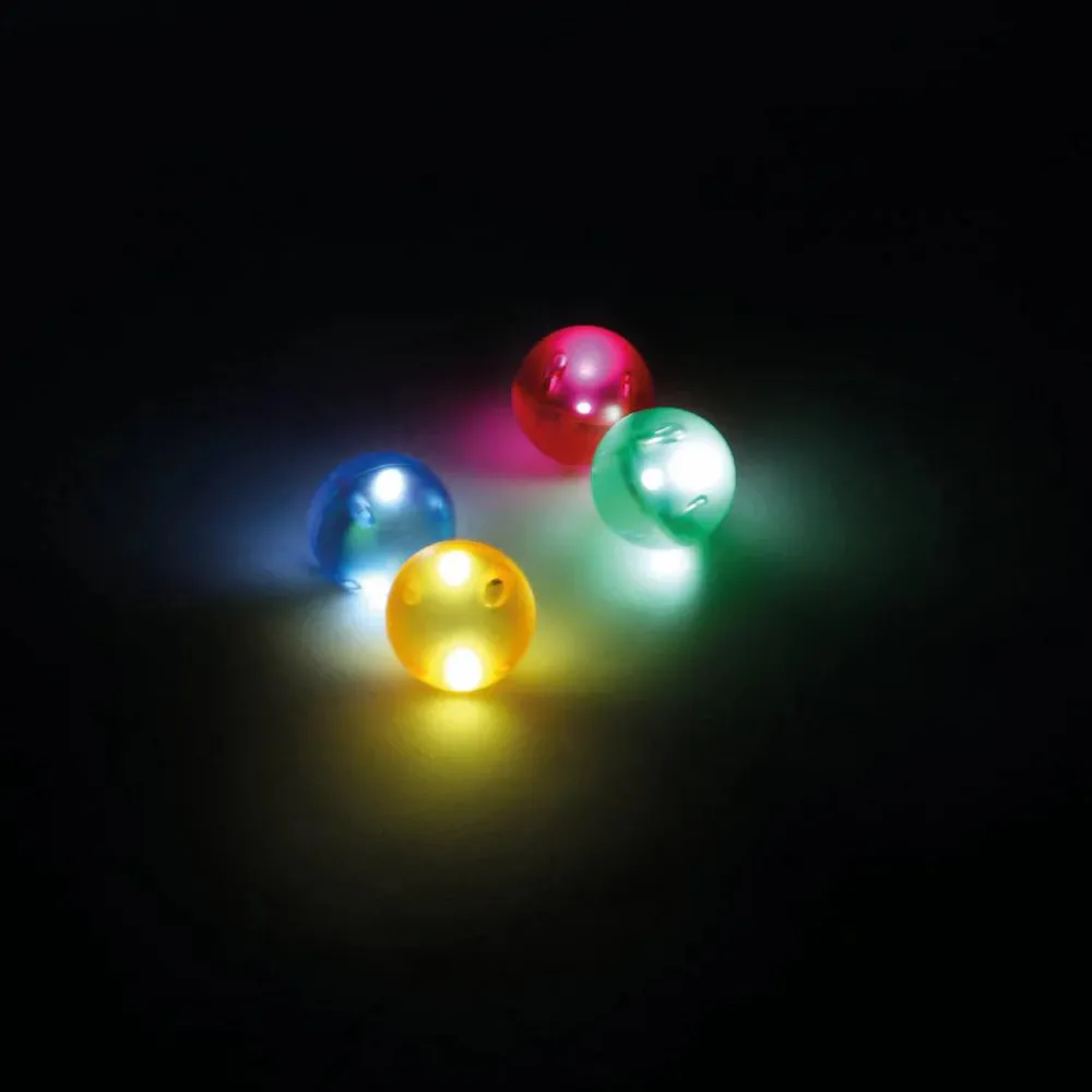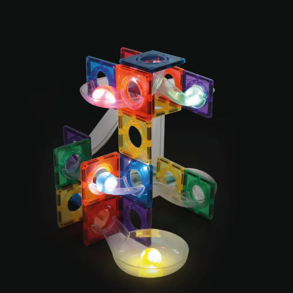 Der er oplevelse og byggeglæde for alle pengene i denne Dazzling Lights Pack kuglebane, for de 4 kugler lyser klart op, når de triller ned. Byg kuglebanen i et mørkt rum eller sluk lyset, så skal I bare se lysende løjer.