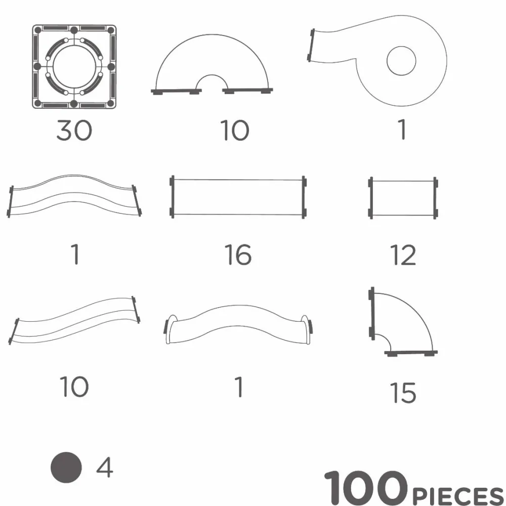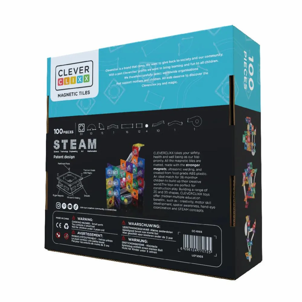 Dette sæt er beregnet til at bygge kuglebaner. Hvis I også vil konstruere andre byggerier, så anbefaler vi, at I supplerer med et andet magnetbyggesæt med byggefliser uden hul i midten. Husk, at Cleverclixx passer til både Magna-Tiles og Connetix.