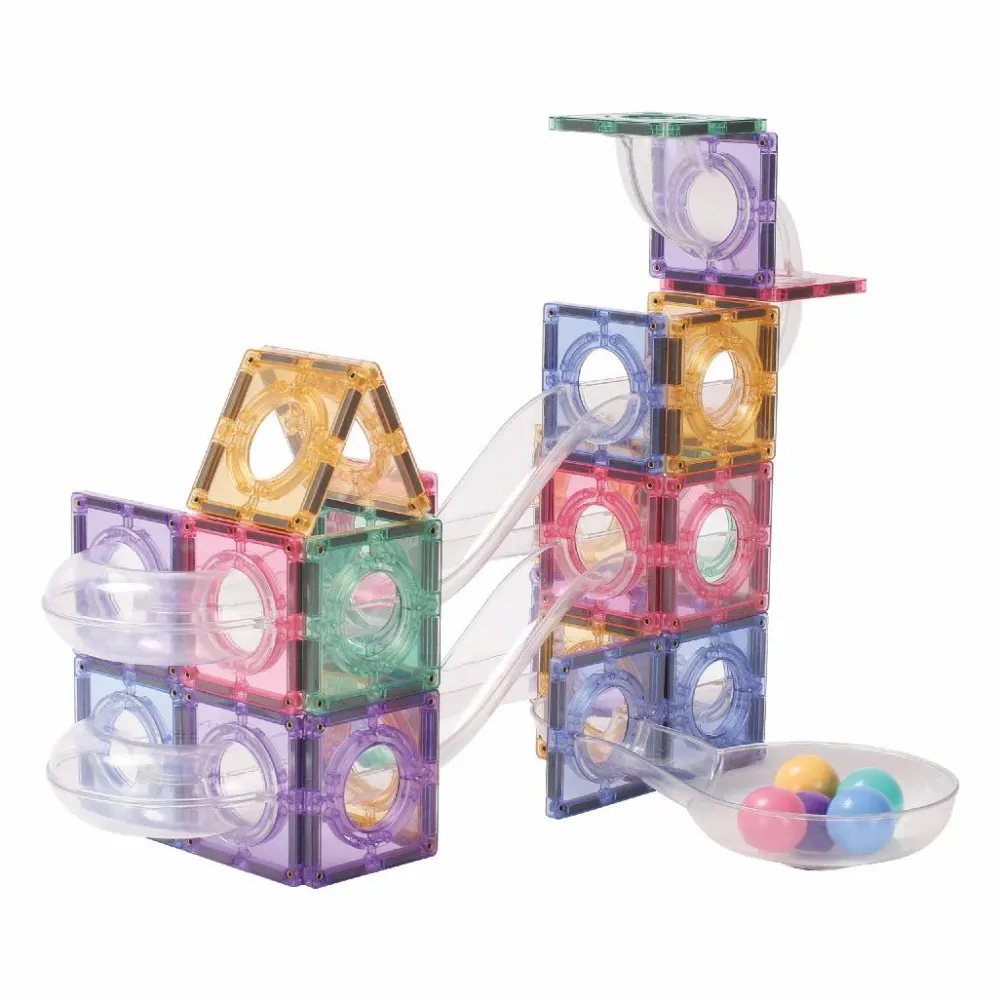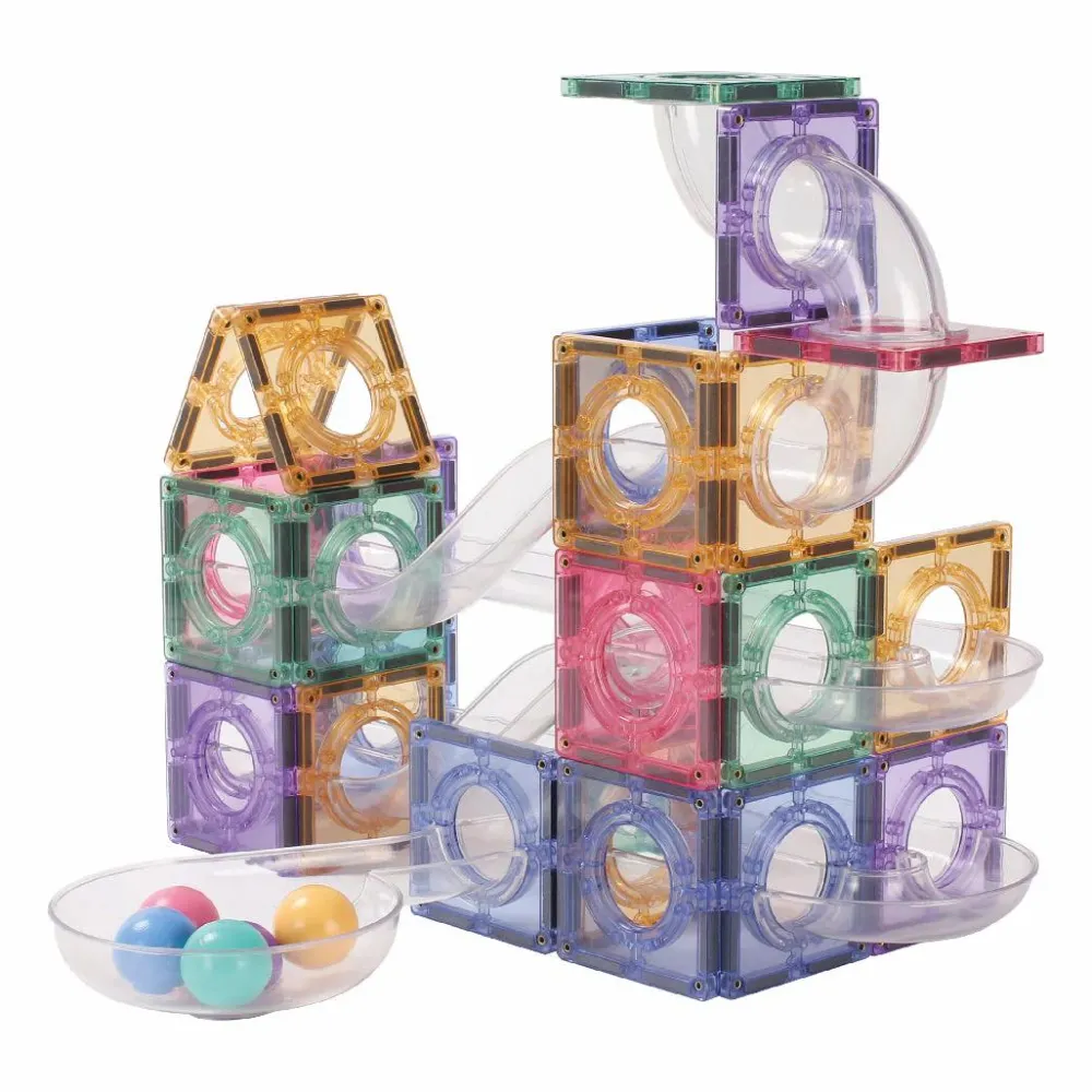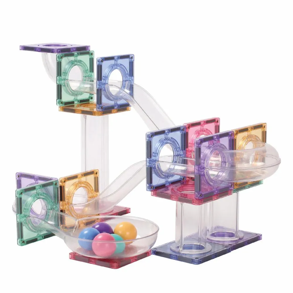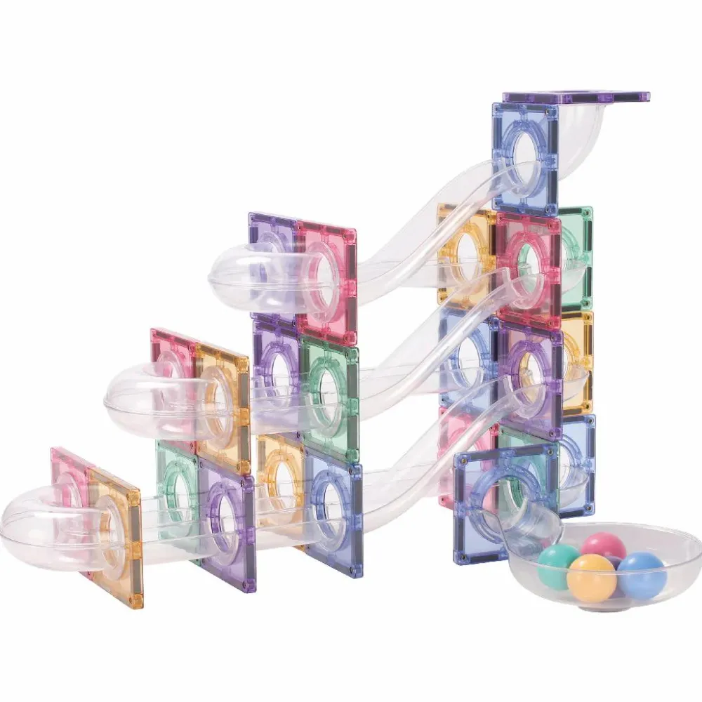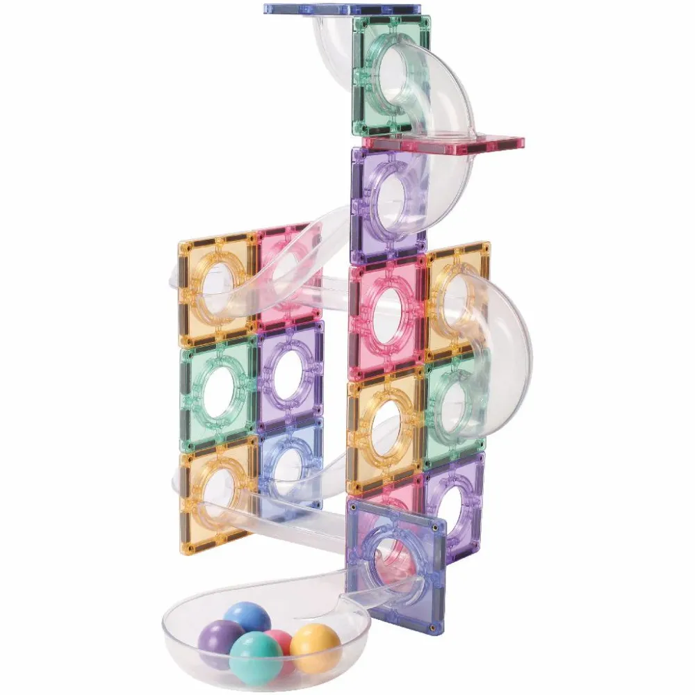I kan bygge kuglebane med dette sæt. Hvis der skal bygges andre konstruktioner, så anbefaler vi, at I supplerer med et af de andre sæt fra enten Cleverclixx, Magna-Tiles eller Connetix med byggefliser uden huller i midten.
