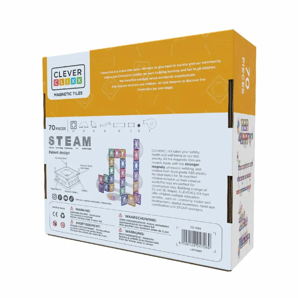 Magnetiske byggefliser bliver hele tiden bedre og mere alsidige. Cleverclixx fra Belgien er smukke og slidstærke byggemagneter, der kom på markedet i 2023 med noget helt nyt: den første magnetiske bilbane med små biler, der drøner rundt på de fine, farvede fliser.