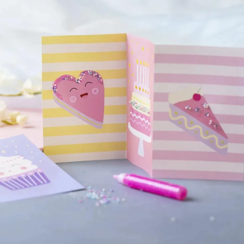 Fint lille og overskueligt projekt, hvor arket med fire kager skal pyntes med glimmerlim og bitte små kulørte glaskugler, som ligner lækker kagekrymmel. Her kan også de utålmodige unger være med og skabe noget fint i en fart.