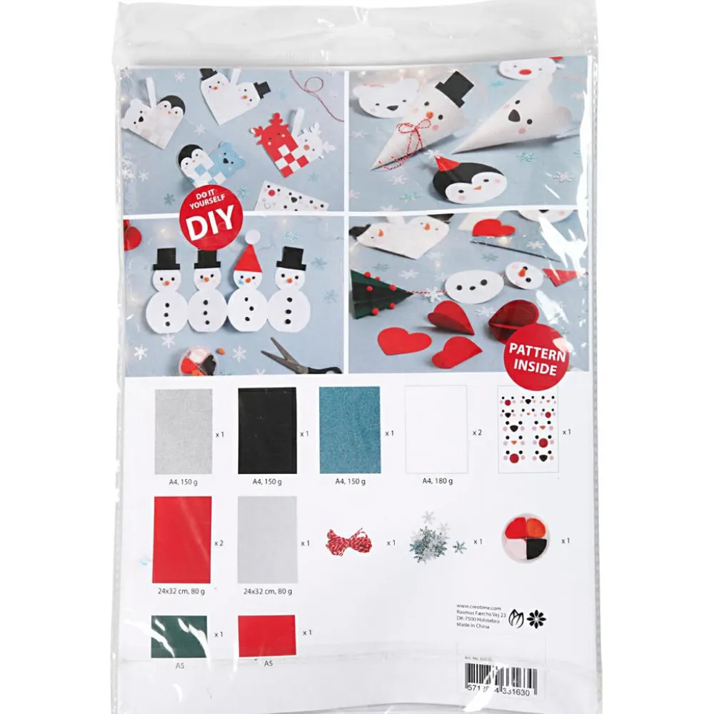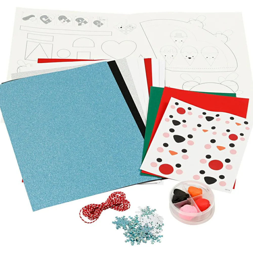 Sættet indholder: Glitterpapir i tre farver, rød/hvid bomuldssnor til ophæng, Silk Clay og karton i forskellige farver, hvidt og rødt glanspapir, stickers ark med øjne og næser samt 10 g pailetter