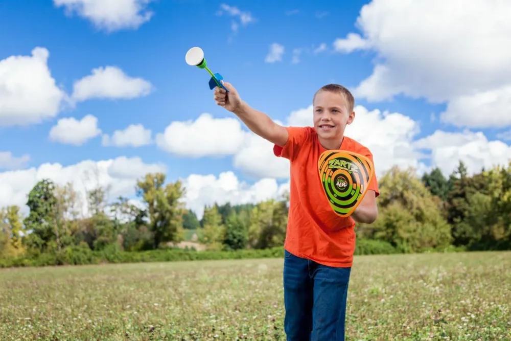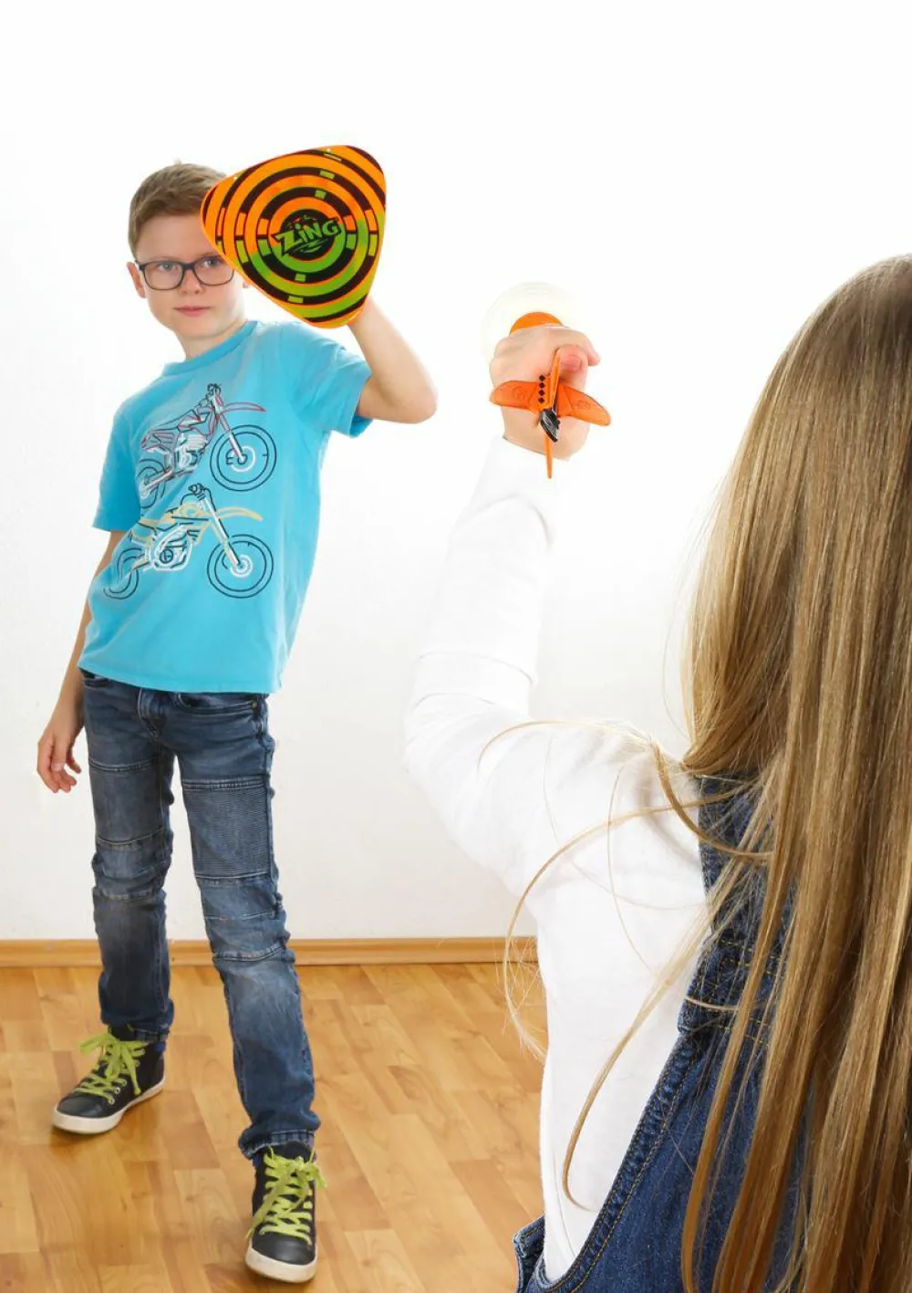 Hver spiller tager et skjold på armen, og så gælder det om at ramme modstanderen med en af pilene, som kastes og kan sidde fast på skjoldet ved hjælp af sugekoppen.